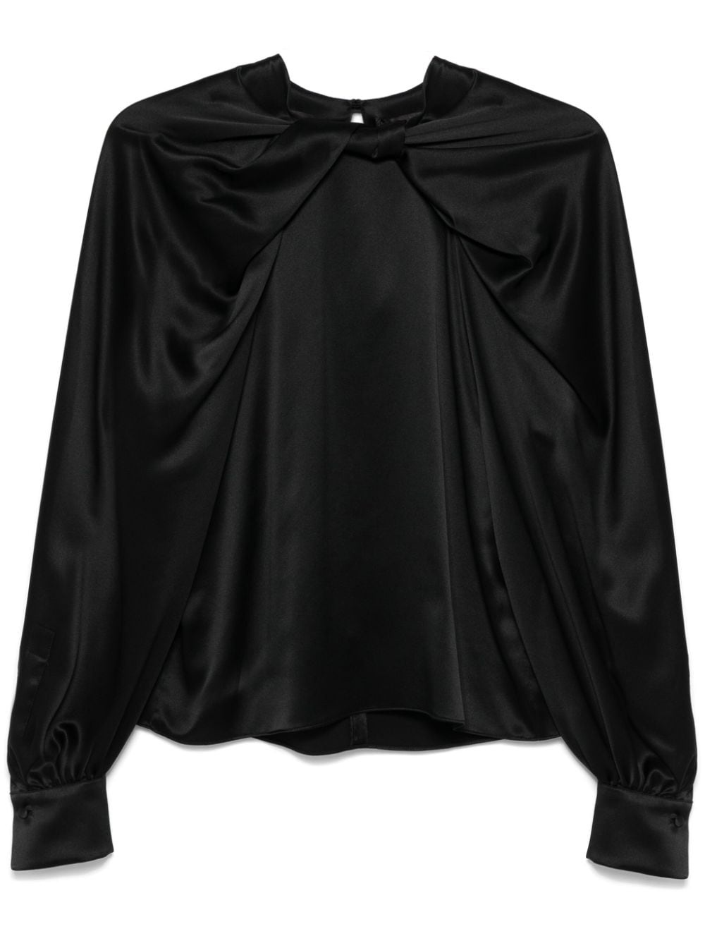 Key blouse Highlights - Black - Silk - Satin finish - Single rear button fastening - Knot detailing - Twist detailing - Ruched detailing - Draped detailing - Inverted pleat - Pleat detailing - Long sleeves - Buttoned cuffs - Curved hem Made in Italy Composition Silk 100% SIZE & FIT Model measurements Height 5 ft 10 in(1.78 m) Bust/Chest 33.85 in(86 cm) Hips 36.61 in(93 cm) Waist 26.77 in(68 cm) FittingInformation Designed to be unstructured, offering a loose fit throughout Made from a midweight non-stretch fabric