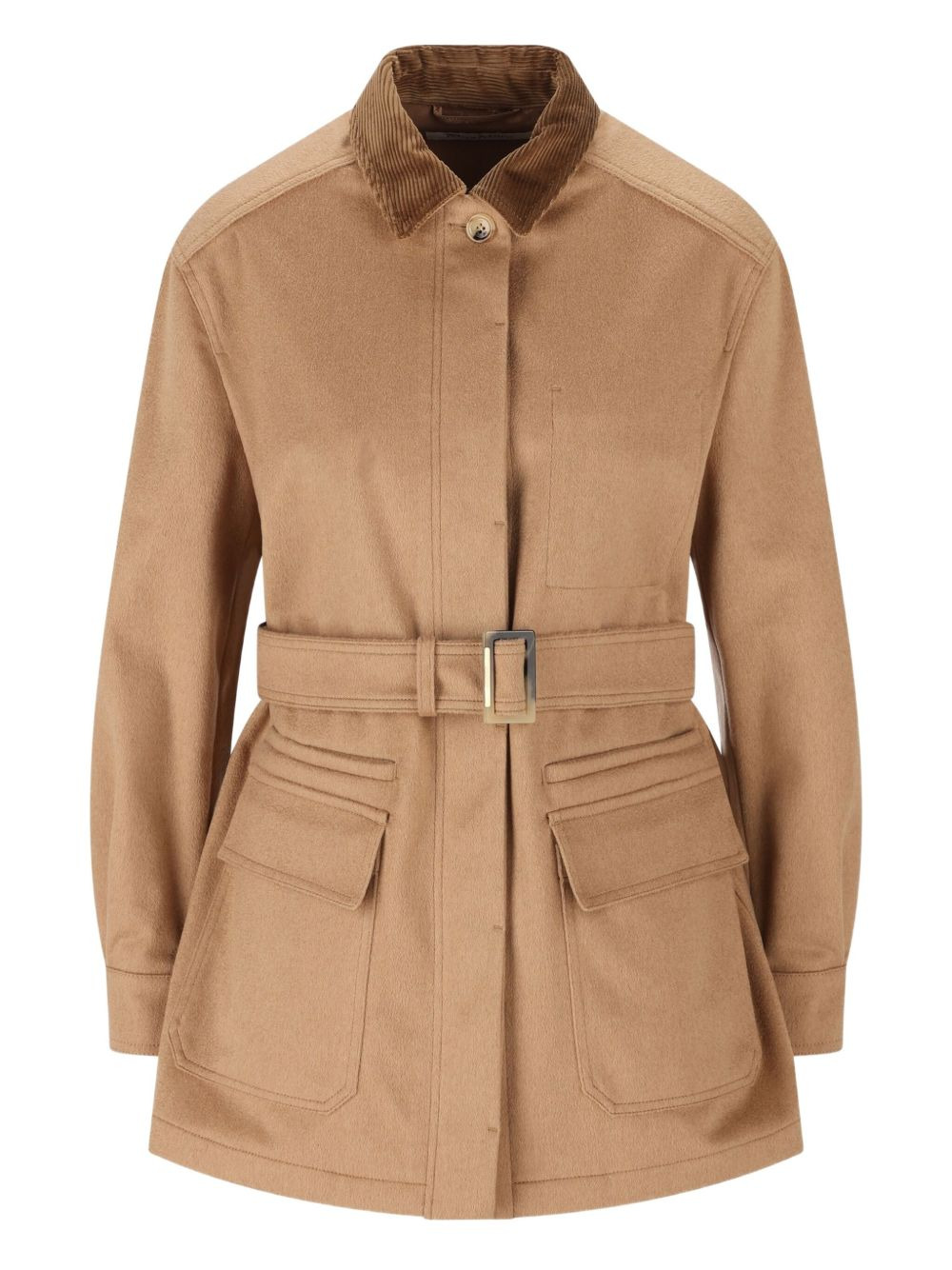 LEVA corduroy-collar belted jacket Highlights - Brown - Corduroy collar - Button fastening - Belt - Front flap pockets - Camel wool Made in Italy Composition Camel Hair 100% Washing instructions Read Manufacturer Guidelines