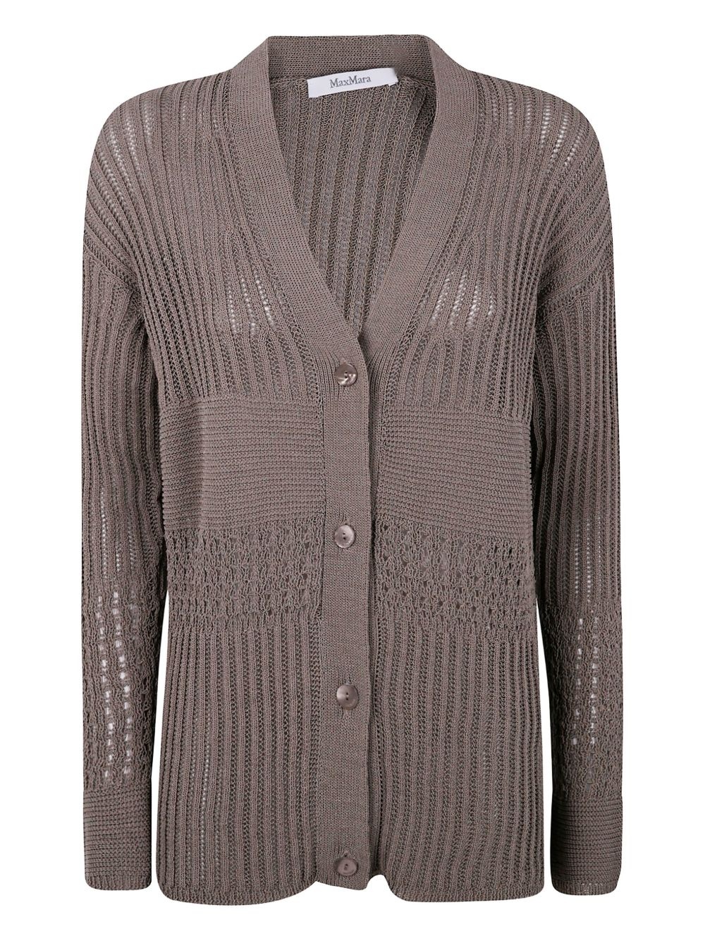 March knitted button-up cardigan Highlights - Beige - Ribbed knit - V-neck - Button fastenings - Textured panel design - Long sleeves Made in Italy Composition Cotton 75%, Polyamide 25% Washing instructions Read Manufacturer Guidelines
