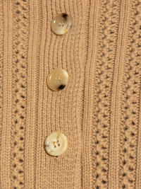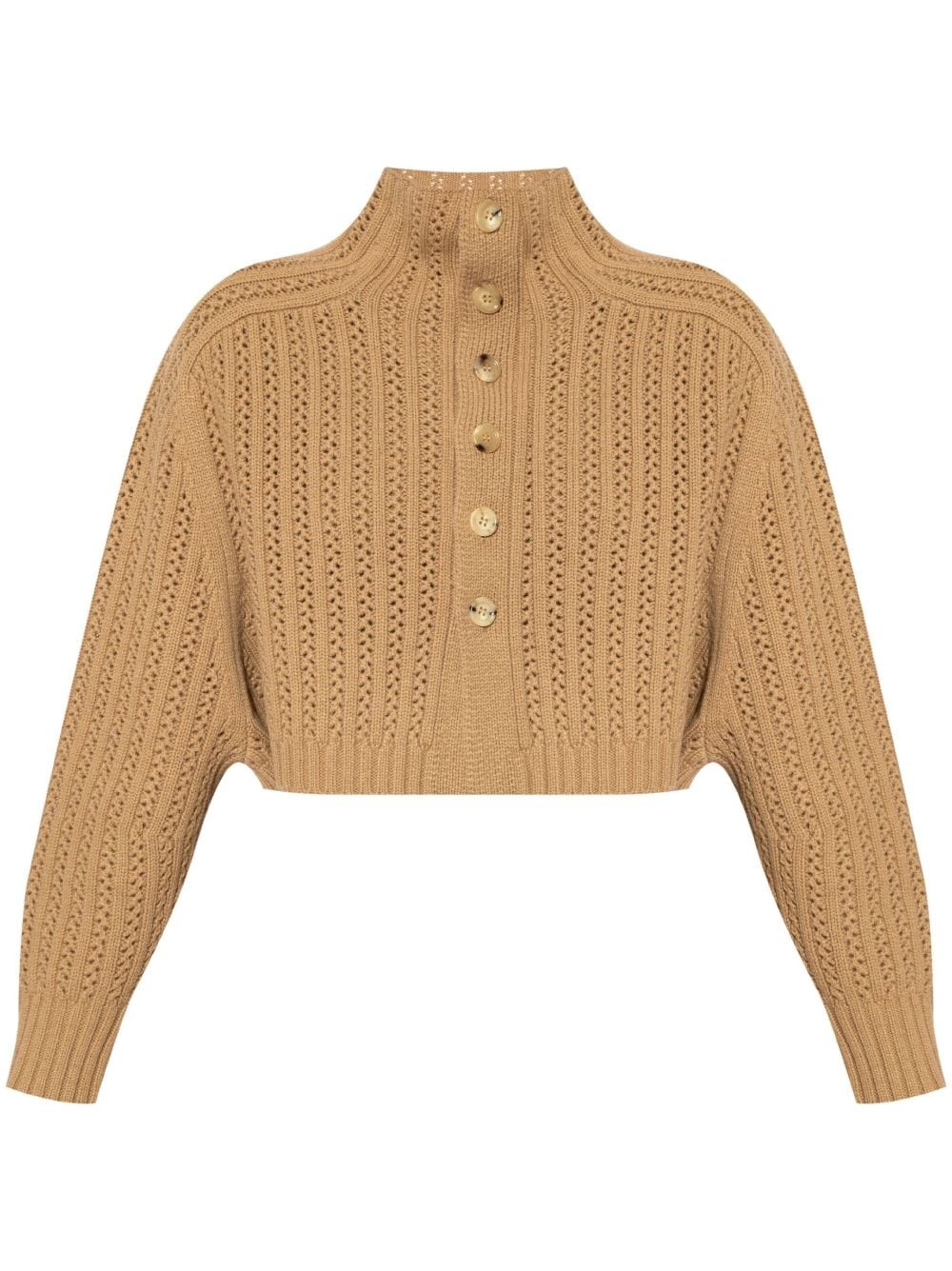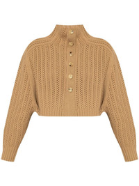 Hodeida cropped sweater Highlights - Camel brown - Wool-cashmere blend - Knitted construction - Perforated detailing - High neck - Front button fastening - Long sleeves - Ribbed cuffs and hem - Cropped Made in Italy Composition Wool 70%, Cashmere 30% SIZE & FIT FittingInformation Designed for a relaxed fit, this piece allows for comfort and movement when worn Made with a midweight knit, this piece offers some stretch