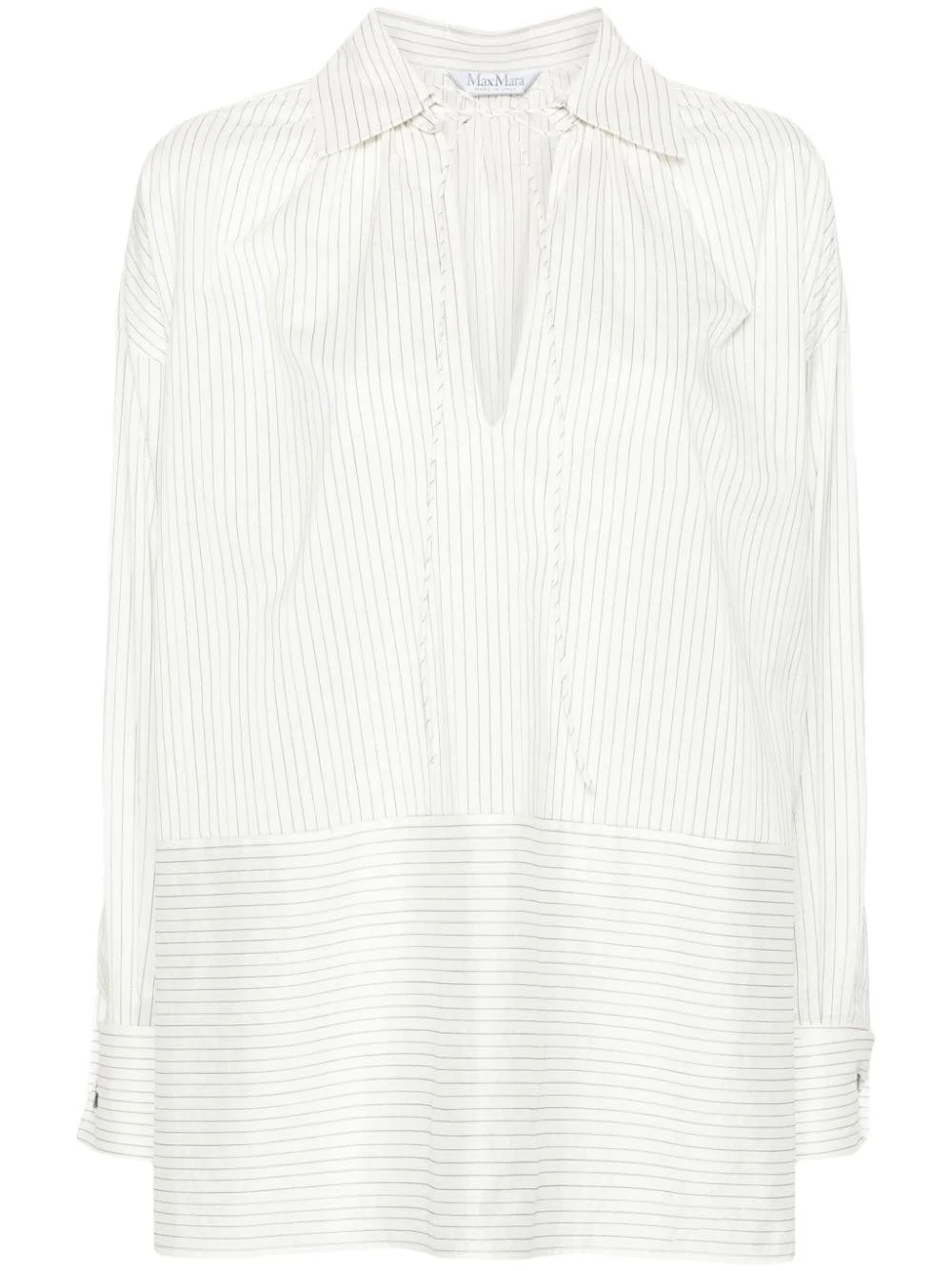 pinstriped spread-collar shirt Highlights - White - Cotton-silk blend - Pinstripe pattern - Spread collar - Split neck - Neck tie fastening - Drop shoulder - Long sleeves - French cuffs - Short side slits - Straight hem Made in Italy Composition Cotton 80%, Silk 20% Washing instructions Dry Clean Only
