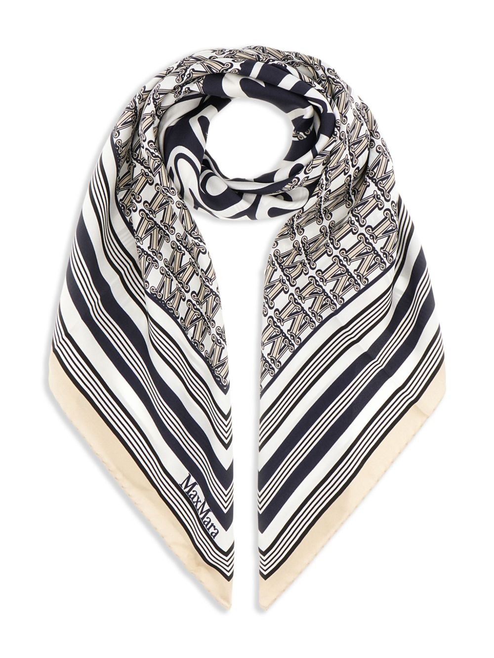 printed silk foulard Highlights - Navy blue - Square shape - All-over logo print - Striped border - Finished edge Made in Italy Composition Silk 100% SIZE & FIT Measurement LENGTH 35.43 in(90 cm) WIDTH 35.43 in(90 cm) Washing instructions Dry Clean Only