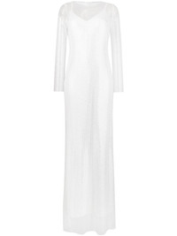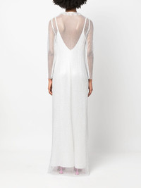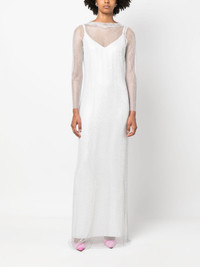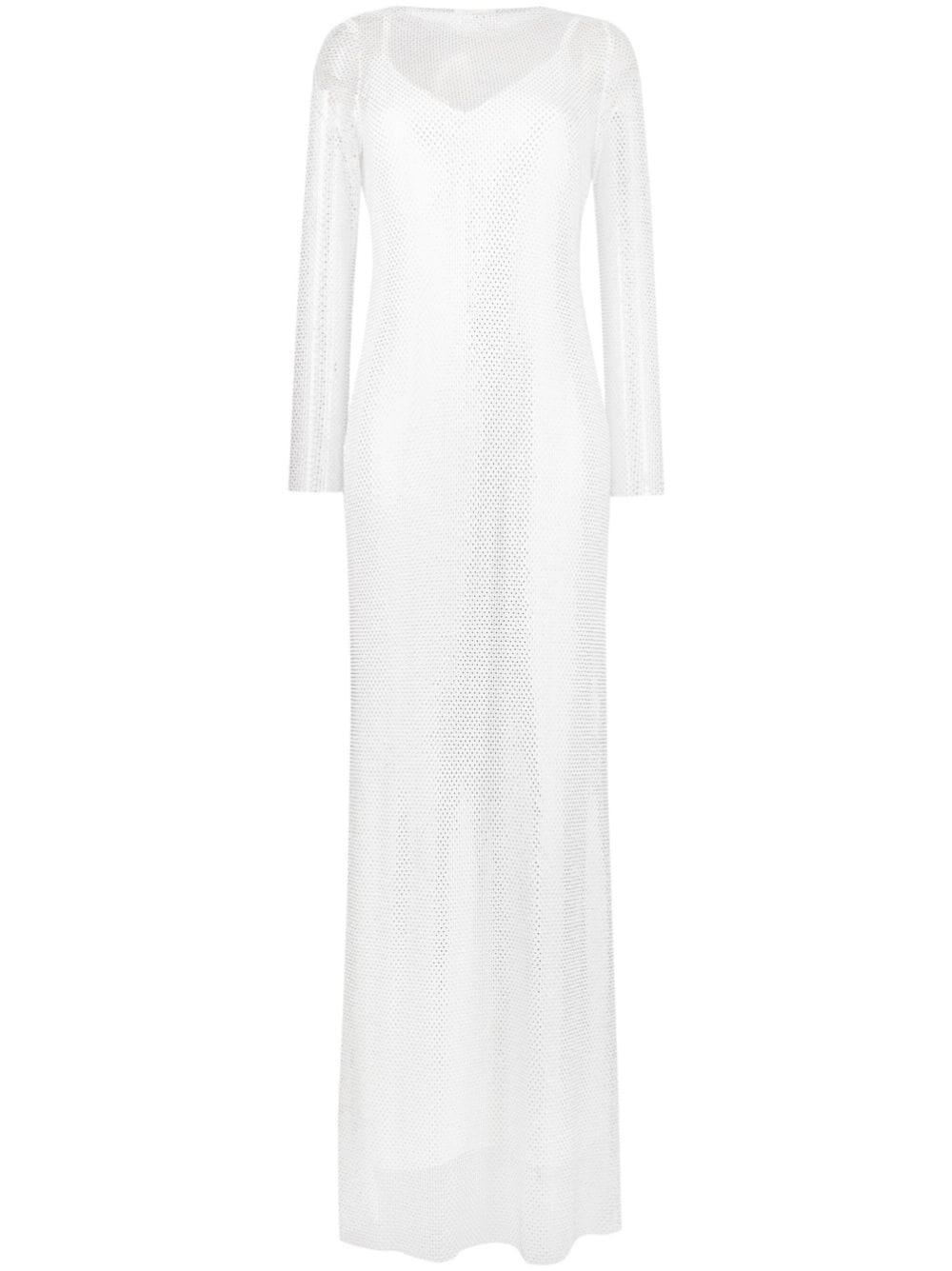 rhinestone-mesh layered maxi dress Highlights - White - Mesh panelling - Rhinestone embellishment - Spaghetti straps - Boat neck - Low back - Long sleeves - Long length Made in Italy Composition Outer: Polyester 96%, Spandex/Elastane 4% Lining: Viscose 100%, Acetate 68%, Polyester 32% SIZE & FIT Model measurements Height 5 ft 10 in(1.77 m) Bust/Chest 33.07 in(84 cm) Hips 37 in(94 cm) Waist 24.8 in(63 cm) FittingInformation Designed for a slim fit that sits just away from the body offering a close yet comfortable fit The detachable slip sits just away from the body, offering a close yet comfortable fit Made from a heavyweight stretch fabric, this piece offers elasticity and flexibility when worn This piece fits true to size – take your usual size