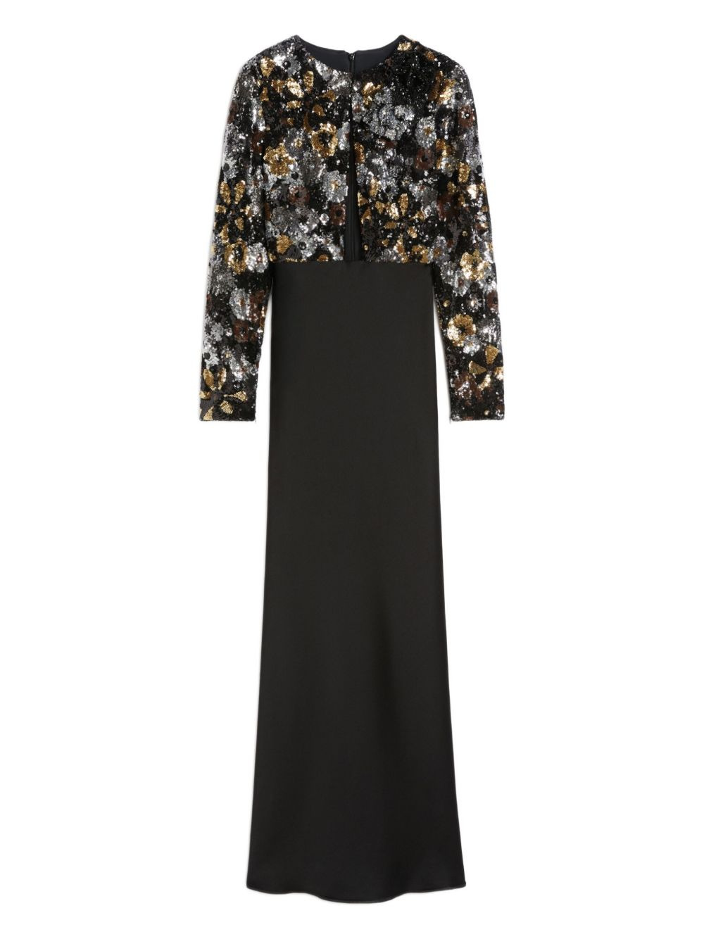 sequin-embellished maxi dress Highlights - Black - Sequin embellishment - Long sleeves - Round neck - Concealed zip fastening - Floor length Imported Composition Outer: Polyester 100%, Acetate 71%, Viscose 29% Lining: Acetate 85%, Silk 10%, Polyamide 5% Washing instructions Read Manufacturer Guidelines