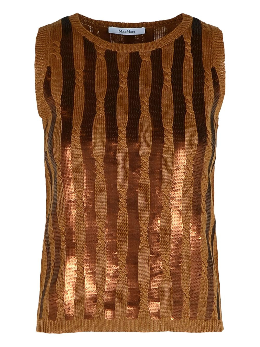 sequin-embellishment cable-knit top Highlights - Brown - Sequin embellishment - Cable knit - Sleeveless - Round neck - Ribbed hem Made in Italy Composition Flax 100% SIZE & FIT FittingInformation Designed for a relaxed fit, this piece allows for comfort and movement when worn Made with a midweight knit, this piece offers some stretch Washing instructions Read Manufacturer Guidelines