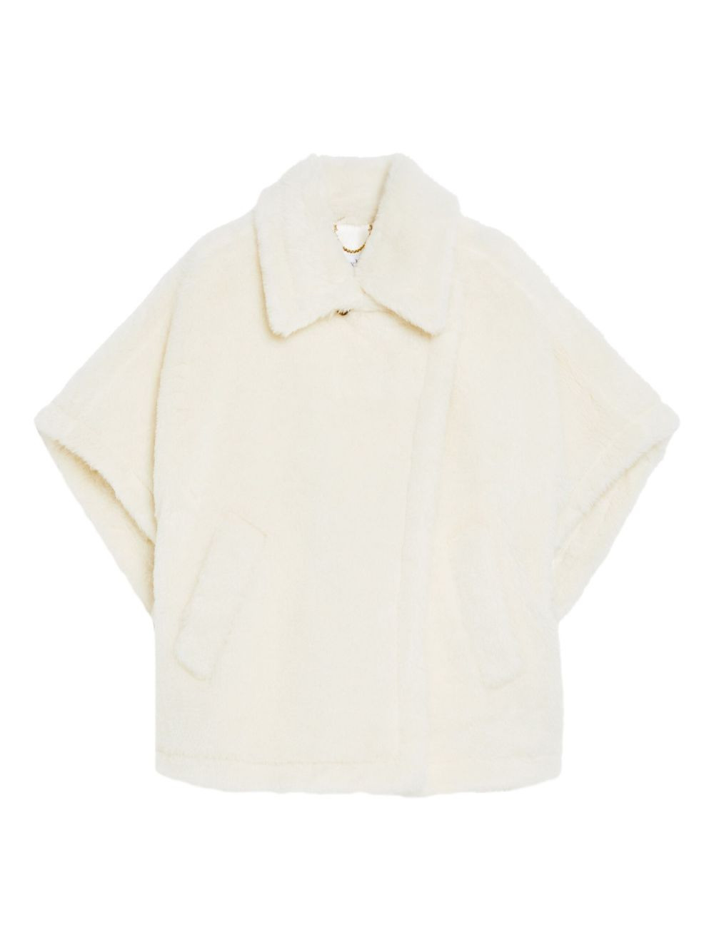short-sleeve collared cape Highlights - White - Short sleeves - Collared neckline - Patch pocket - Teddy-bear texture Made in Italy Composition Alpaca 62%, Wool 26%, Silk 12% Washing instructions Read Manufacturer Guidelines