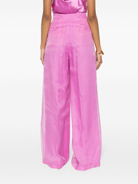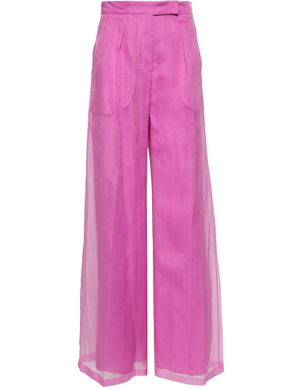 silk sheer straight trousers Highlights - Fuchsia pink - Silk - Semi-sheer construction - Contrasting panel detail - Pleat detailing - Two side slash pockets - Pressed crease - Two rear welt pockets - Internal logo tag - Full lining - Wide leg - Concealed front button, hook and zip fastening Made in Italy Composition Lining: Acetate 85%, Silk 10%, Polyamide 5% Outer: Silk 100% SIZE & FIT Model measurements Height 5 ft 9 in(1.76 m) Bust/Chest 31.1 in(79 cm) Hips 36.61 in(93 cm) Waist 24.8 in(63 cm) FittingInformation Designed with a wide-leg cut, these trousers allow for a close fit at the waist and offer a loose and roomy fit over the leg Made from a lightweight non-stretch fabric This piece fits true to size – take your usual size Washing instructions Dry Clean Only