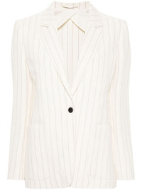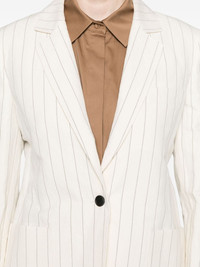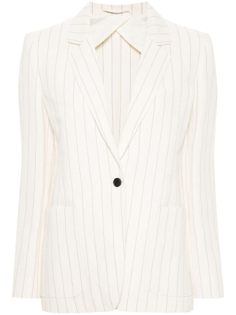single-breasted pinstriped blazer Highlights - Ivory white - Cotton-linen blend - Canvas - Pinstripe pattern - Notched lapels - Shoulder pads - Long sleeves - Chest welt pocket - Two side patch pockets - American rear vent - Partial lining - Front button fastening Made in Italy Composition Outer: Linen/Flax 58%, Cotton 42% Lining: Viscose 56%, Cotton 44% SIZE & FIT Model measurements Height 5 ft 9 in(1.75 m) Bust/Chest 34.64 in(88 cm) Hips 36.61 in(93 cm) Waist 26.37 in(67 cm) FittingInformation Designed for a slim fit that sits just away from the body offering a close yet comfortable fit The internal shoulder pads offer a structured shape Made from a midweight non-stretch fabric This piece fits true to size – take your usual size Washing instructions Dry Clean Only