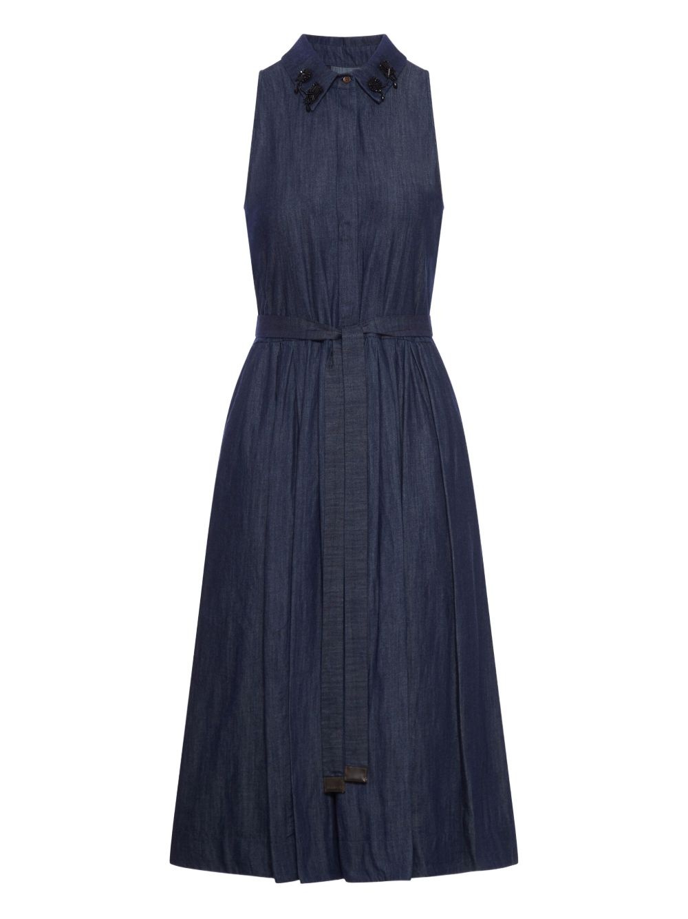 sleeveless denim dress Highlights - Navy blue - Sleeveless - Classic collar - Belted waist - Front button fastening Made in Italy Composition Cotton 100% Washing instructions Read Manufacturer Guidelines