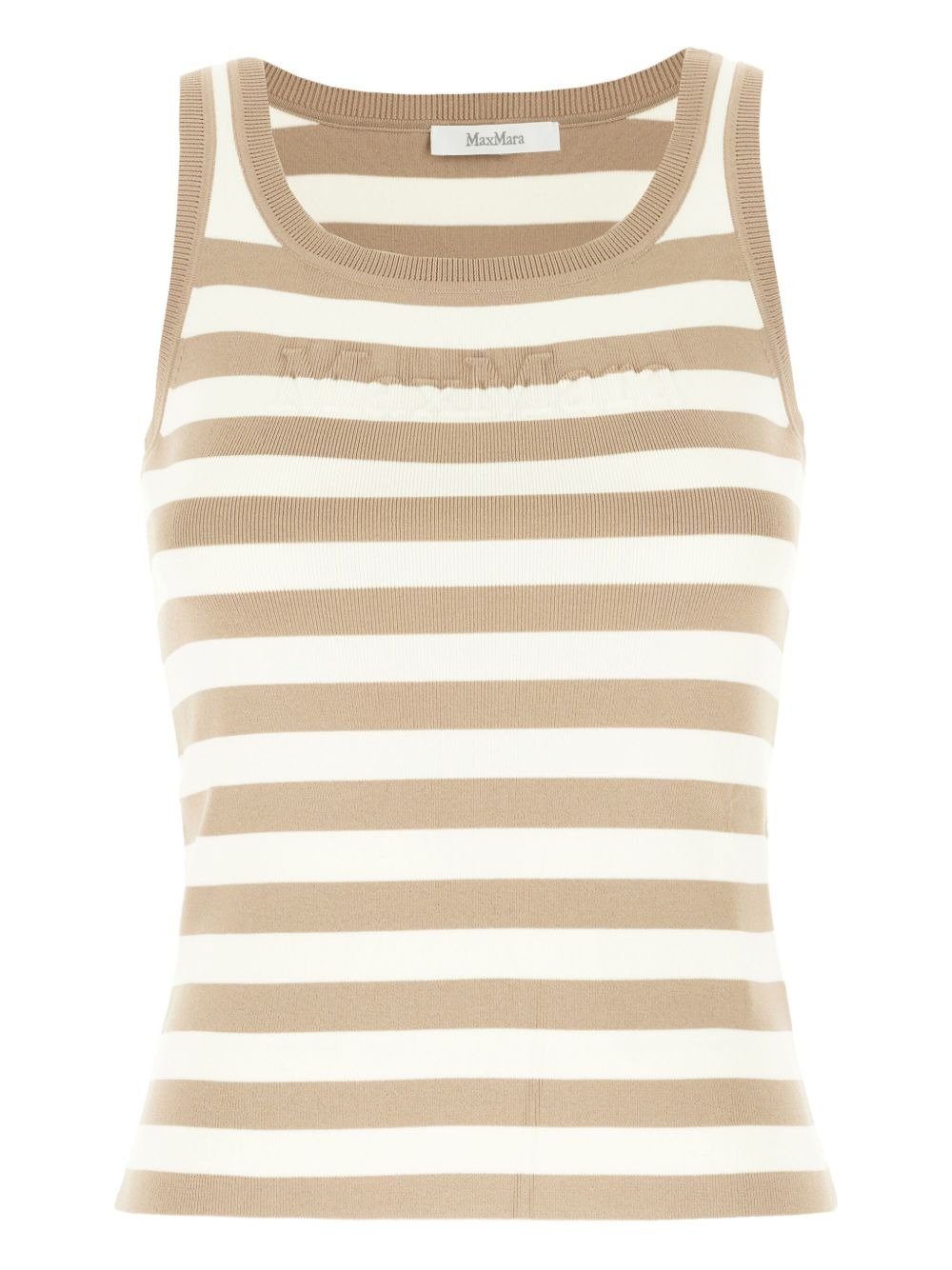 striped-pattern ribbed-knit top Highlights - Beige - Horizontal stripes - Ribbed knit - Sleeveless - Round neck Imported Composition Viscose 65%, Polyamide 35% Washing instructions Read Manufacturer Guidelines