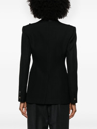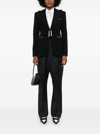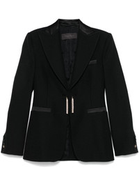 tassel-detail blazer Highlights - Black - Virgin wool - Grain de poudre - Crystal-embellished tassel detail to the front - Front clasp fastening - Satin trim - Peak lapels - Long sleeves - Buttoned-cuff sleeves - Chest welt pocket - Two side slit pockets - Central rear vent - Logo-jacquard lining - Straight hem Made in Italy Composition Lining: Acetate 65%, Polyester 35% Outer: Virgin Wool 100% SIZE & FIT Model measurements Height 5 ft 11 in(1.8 m) Bust/Chest 32.67 in(83 cm) Hips 35.82 in(91 cm) Waist 25.98 in(66 cm) FittingInformation Designed for a slim fit that sits just away from the body offering a close yet comfortable fit The internal shoulder pads offer a structured shape Made from a midweight non-stretch fabric Washing instructions Dry Clean Only
