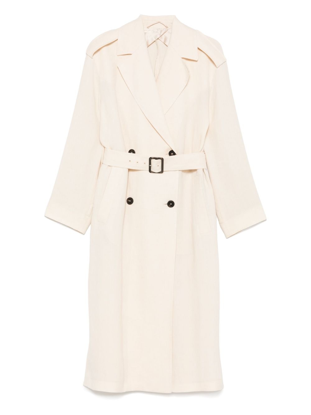 Vieste coat Highlights - Light beige - Double-breasted button fastening - Detachable waist belt - Side slits - Two side welt pockets Imported Composition Outer: Linen/Flax 100% Lining: Viscose 58%, Cupro 42% SIZE & FIT Model measurements Height 5 ft 11 in(1.8 m) Bust/Chest 31.49 in(80 cm) Hips 35.82 in(91 cm) Waist 24.8 in(63 cm) FittingInformation Designed to be unstructured, offering a loose fit throughout The belt offers adjustability for fitted preferences Made from a midweight non-stretch fabric Washing instructions Dry Clean Only