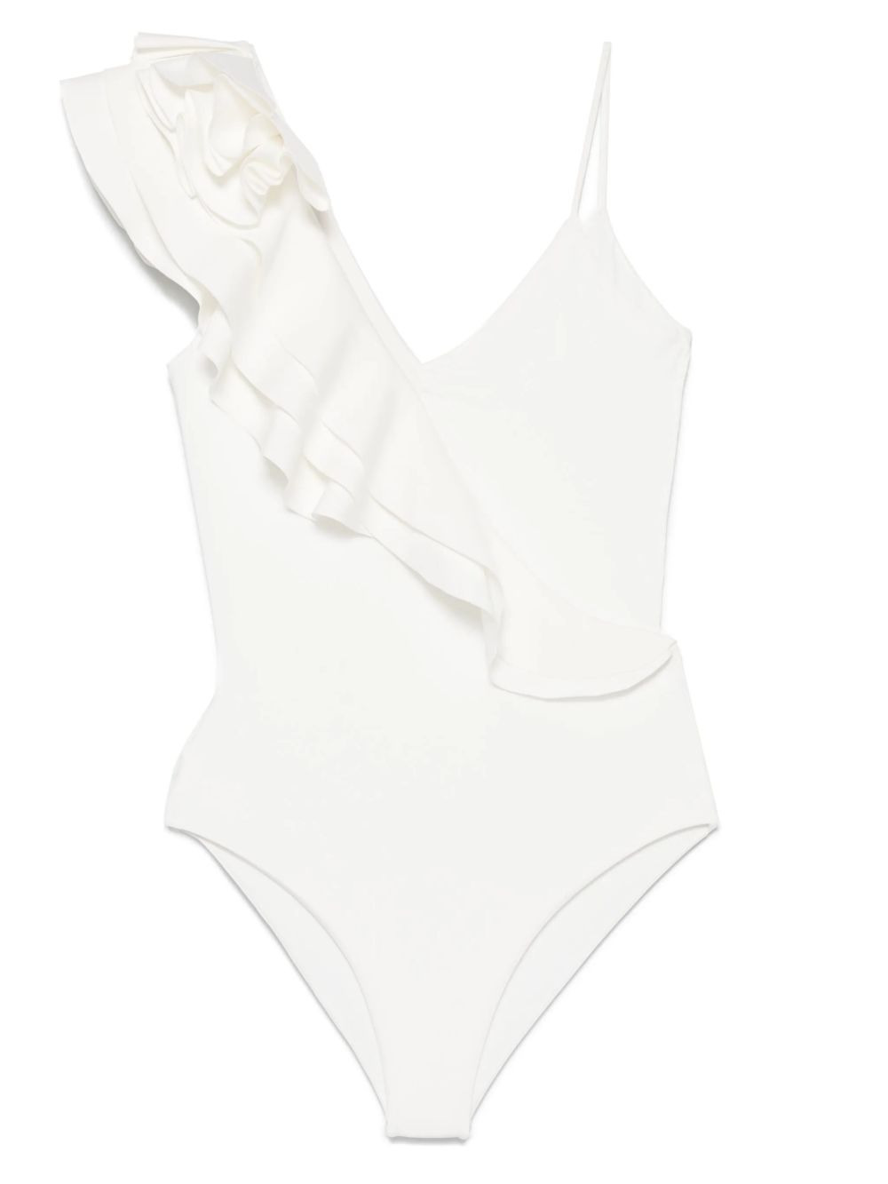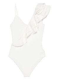 ruffled asymmetric swimsuit Highlights - White - Layered ruffles - Asymmetric sleeve - V-neck - Be mindful to try on swimwear over your own garments. Imported Composition Polyamide 78%, Elastane 22% SIZE & FIT Measurement BUST 27.55 in(70 cm) HIPS 29.13 in(74 cm) WAIST 23.62 in(60 cm) Washing instructions Hand Wash