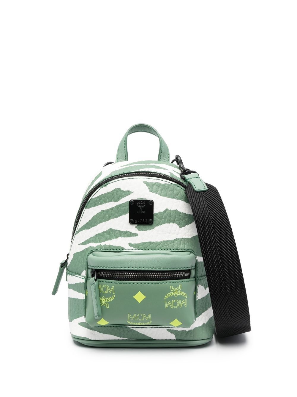 animal-print leather backpack Part of the label's SS23 Meta Safari collection, this backpack by MCM offers a bold take on zebra print. Imagined in pebbled leather, this accessory comes equipped with a front zip-up pocket, fixed top handle and detachable Herringbone crossbody strap for handsfree wear. Highlights - Green - Calf leather - Animal print - Logo print to the front zip-fastening pocket - Logo patch to the front - Adjustable detachable shoulder strap - Top zip fastening Imported Composition Outer: Calf Leather 100% SIZE & FIT Model measurements Height 5 ft 10 in(1.78 m) Bust/Chest 33.07 in(84 cm) Hips 35.82 in(91 cm) Waist 25.98 in(66 cm) Measurement DEPTH 3.93 in(10 cm) HANDLE 1.96 in(5 cm) HEIGHT 7.48 in(19 cm) STRAP 25.59 in(65 cm) WIDTH 9.84 in(25 cm)