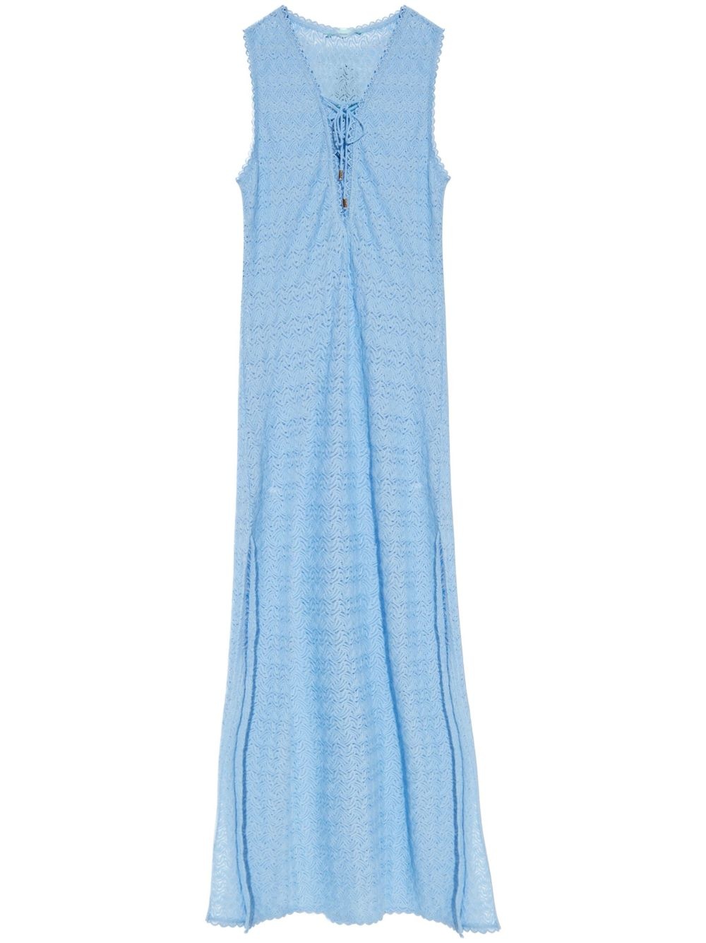 Maddie dress Highlights - Light blue - Front touch-strap fastening - V-neck - Semi-sheer construction - Side slits Imported Composition Polyester 90%, Spandex/Elastane 10% SIZE & FIT Measurement HIPS 34.64 in(88 cm) LENGTH 53.93 in(137 cm) WAIST 29.13 in(74 cm)