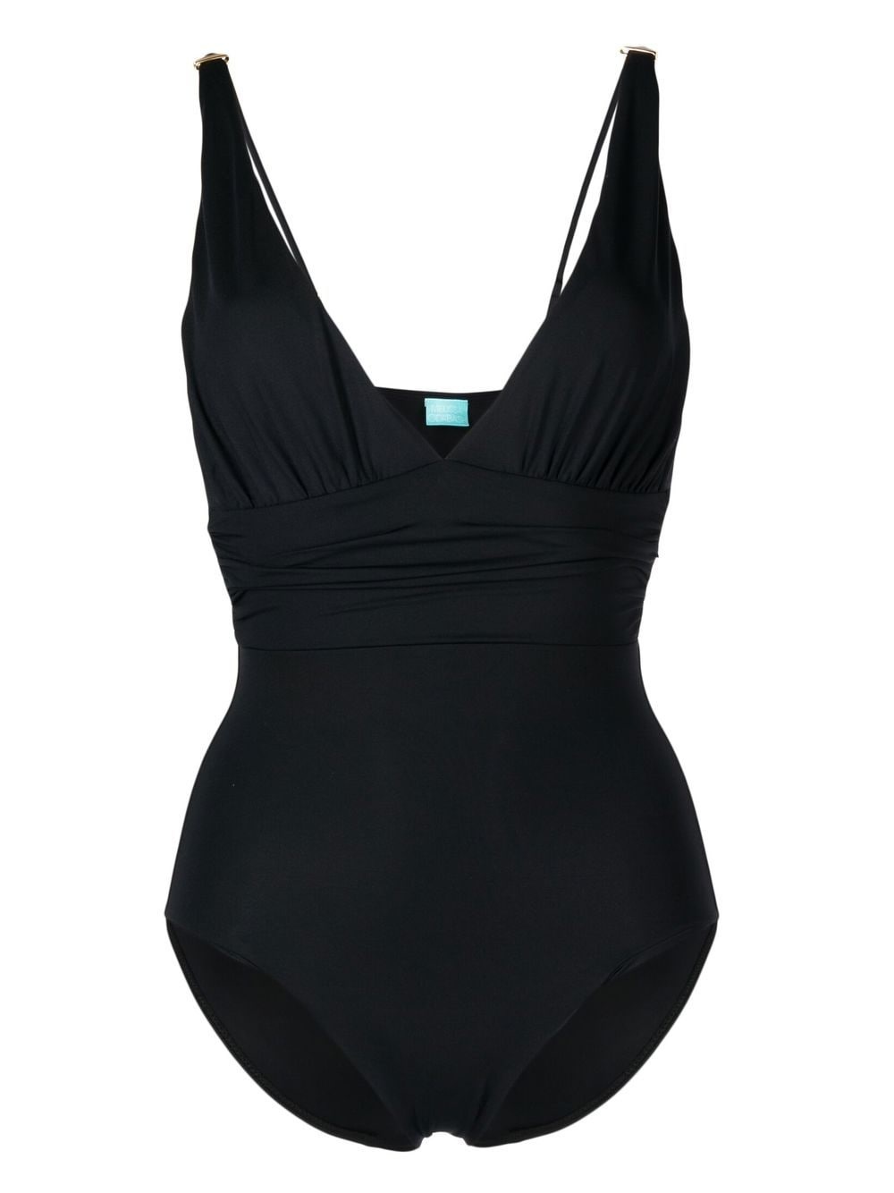 V-neck swimsuit Highlights - Jet black - Stretch-design - Plunging v-neck - Adjustable shoulder straps - Square open back - High cut - Be mindful to try on swimwear over your own garments. Made in Italy Composition Polyamide 86%, Elastane 14%