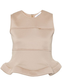 peplum hem sleeveless top Highlights - Light beige - Knitted construction - Concealed zip fastening on the chest - Concealed rear zip fastening - Round neck - Sleeveless - Peplum hem Made in United States Composition Polyester 100% SIZE & FIT Model measurements Height 5 ft 9 in(1.76 m) Bust/Chest 31.1 in(79 cm) Hips 35.03 in(89 cm) Waist 24.4 in(62 cm) FittingInformation Designed for a loose fit at the chest with a close fit over the waist and hips Made from a midweight non-stretch fabric, this piece offers minimal elasticity when worn This piece fits true to size – take your usual size