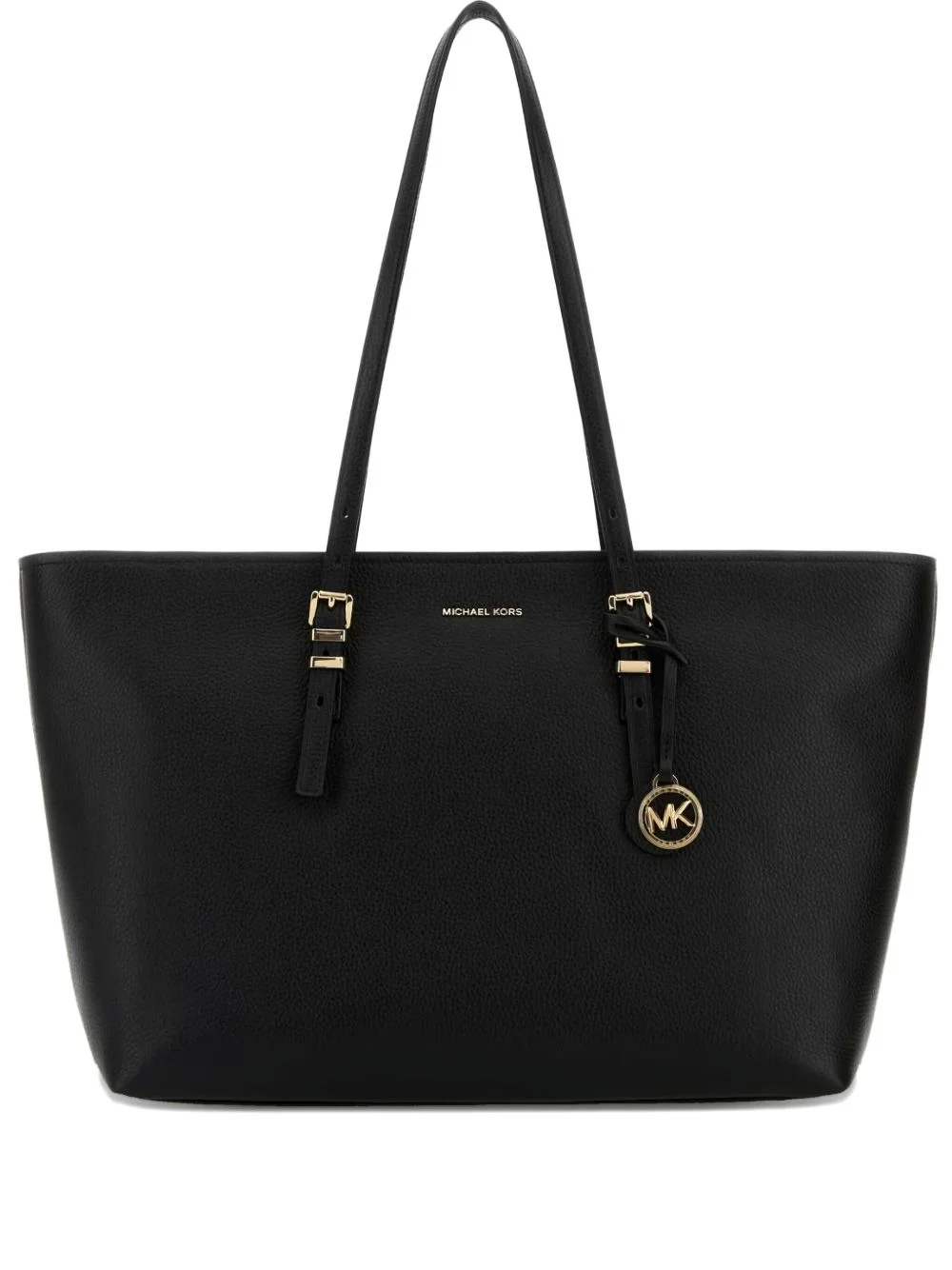 logo-lettering shoulder bag Highlights - Black - Logo pendant charm - Dual flat shoulder straps - Gold-tone hardware - Main compartment - Internal slip pockets Imported Composition Outer: Leather 100%, Polyurethane 60%, Cotton 20%, Polyester 20% Lining: Polyester 100% SIZE & FIT Measurement DEPTH 5.11 in(13 cm) HEIGHT 11 in(27.9 cm) WIDTH 18.5 in(46.9 cm)