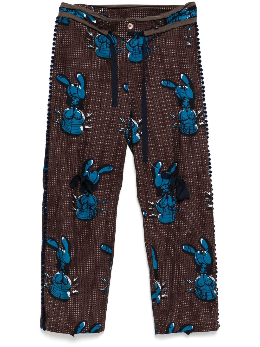 graphic-print trousers Highlights - Navy blue - Front button and zip fastening - Drawstring waist - Two rear jetted pockets - When buying this unisex item, keep in mind that it is graded in standard men's sizing. Imported Composition Outer: Cotton 100% Lining: Cotton 50%, Cupro 50% SIZE & FIT Model measurements Height 6 ft 2 in(1.87 m) Bust/Chest 33.07 in(84 cm) Hips 35.43 in(90 cm) Waist 26.77 in(68 cm) FittingInformation This piece is unisex and is designed with a wide-leg, whether you usually select women's or men's sizes Adjust this piece’s waistband to your preference using the drawstring Made from a midweight non-stretch fabric Washing instructions Dry Clean Only