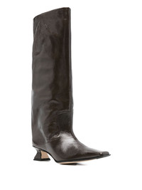 pointed-toe boots Highlights - Brown - Coated finish - Pointed toe - Block heel - Pull-on style - Knee-high shaft Imported Composition Outer: Patent Calf Leather 100% Lining: Calf Leather 100% Sole: Leather 100% SIZE & FIT Measurement HEEL 1.37 in(3.5 cm)