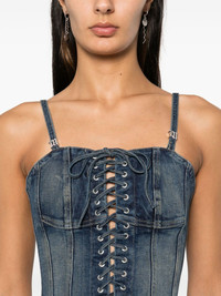 Lara corset Highlights - Indigo blue - Cotton blend - Denim - Corset style - Front lace-up fastening - Rear zip fastening - Bustier-style neckline - Crystal embellished logo plaque - Adjustable spaghetti straps - Frayed high-low hem Imported Composition Cotton 78%, Recycled Cotton 20%, Elastane 2% SIZE & FIT Model measurements Height 5 ft 10 in(1.77 m) Bust/Chest 30.7 in(78 cm) Hips 35.03 in(89 cm) Waist 23.62 in(60 cm) FittingInformation Designed for a close fit throughout The adjustable shoulder straps allow for a preferred fit when worn Constructed from stretch denim, this piece offers a stretch fit with durability
