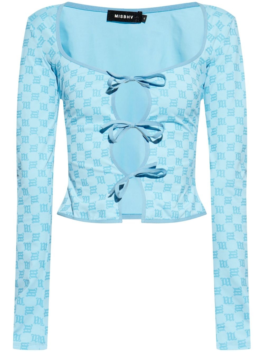 monogram cropped top Highlights - Light blue - Front tie fastening - Cut-out detailing - Scoop neck - Long sleeves Imported Composition Polyamide 78%, Elastane 22%