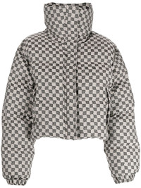 monogram-print cropped puffer jacket beige black monogram print spread collar concealed front fastening long sleeves two side slit pockets straight hem cropped Imported Composition Polyester 66%, Cotton 34% SIZE & FIT Model measurements Height 5 ft 10 in(1.77 m) Bust/Chest 31.49 in(80 cm) Hips 35.43 in(90 cm) Waist 25.19 in(64 cm) Measurement SLEEVE LENGTH 23.62 in(60 cm) LENGTH 20.07 in(51 cm) WAIST 49.6 in(126 cm) BUST 50.39 in(128 cm) Shoulder Width 20.47 in(52 cm) FittingInformation This piece fits true to size. We recommend you get your regular size Cut for a loose fit Made with a heavyweight non-stretch fabric Washing instructions Dry Clean Only