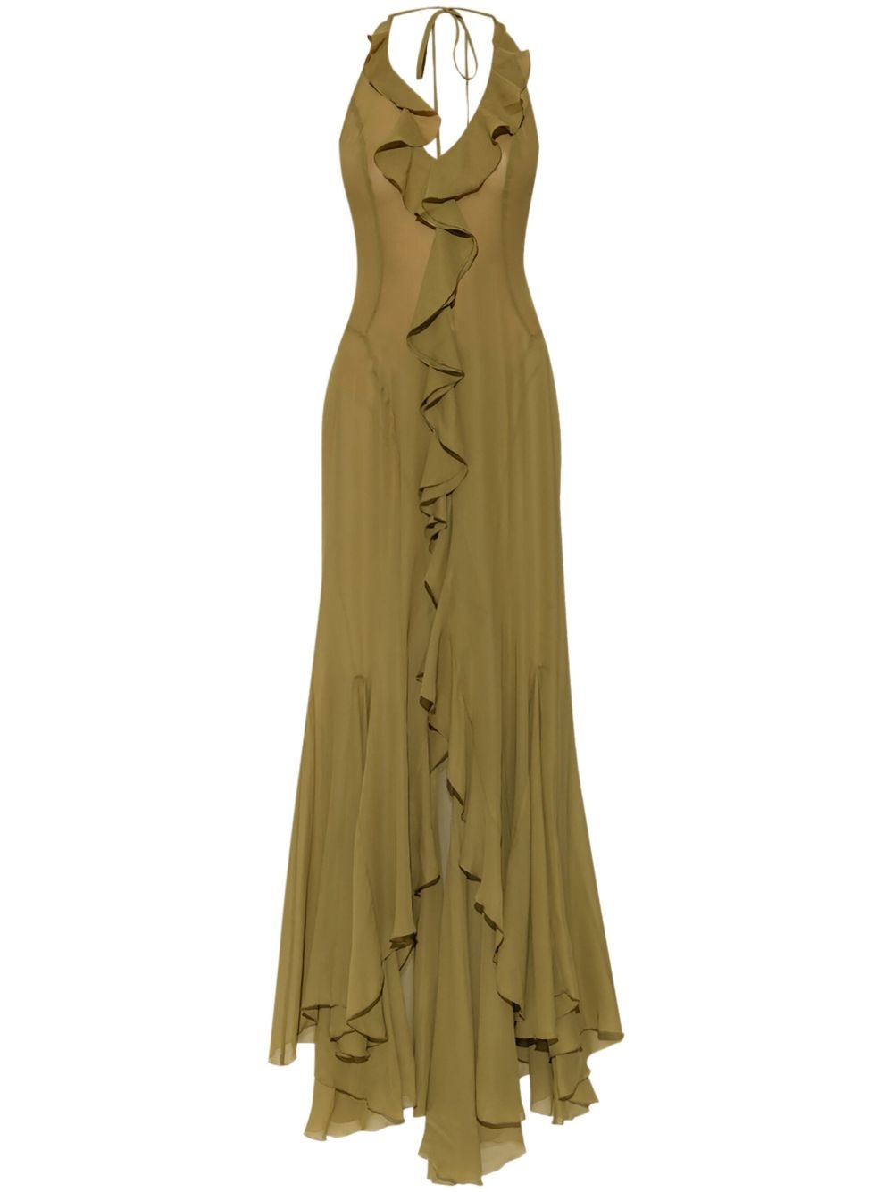 ruffle-detailing midi dress Highlights - Olive green - Halterneck tie fastening - Open back - Flared hem - Mid-length Imported Composition Recycled Viscose 100%