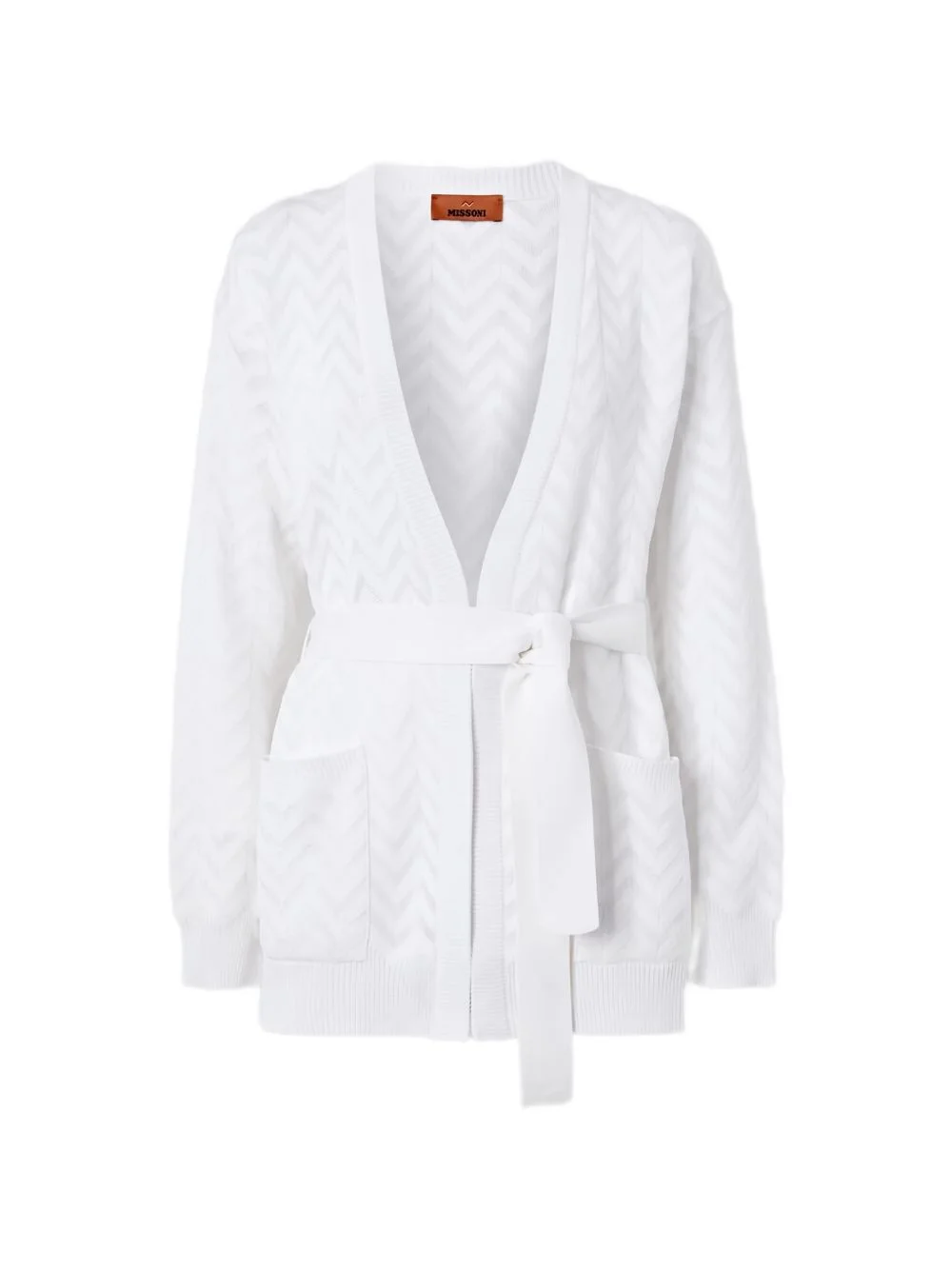 chevron belted knitwear Highlights - White - Chevron pattern - V-neck - Belt - Front pockets - Long sleeves - The item you receive may differ slightly from the item photographed. this is due to the artisanal nature with which all missoni products are constructed. Made in Italy Composition Outer: Cotton 63% Rayon 35%, Polyamide 2% Washing instructions Hand Wash