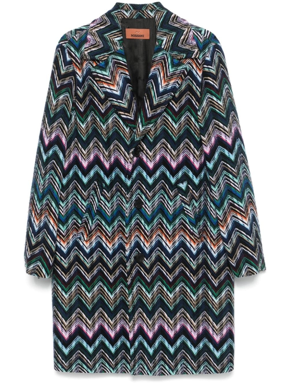 chevron-knit coat Highlights - Black/multicolour - Wool blend - Chevron knit - Front button fastening - Notched lapels - Long sleeves - Two side welt pockets - Central rear vent - Logo-jacquard lining - Straight hem - The item you receive may differ slightly from the item photographed. this is due to the artisanal nature with which all missoni products are constructed. Made in Italy Composition Outer: Wool 74%, Cotton 26% Lining: Viscose 100% SIZE & FIT Model measurements Height 5 ft 8 in(1.72 m) Bust/Chest 31.88 in(81 cm) Hips 34.64 in(88 cm) Waist 23.62 in(60 cm) FittingInformation Designed to be unstructured, offering a loose fit throughout The vented hem offers movement at the rear Made from a midweight non-stretch fabric Washing instructions Dry Clean Only