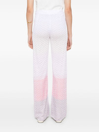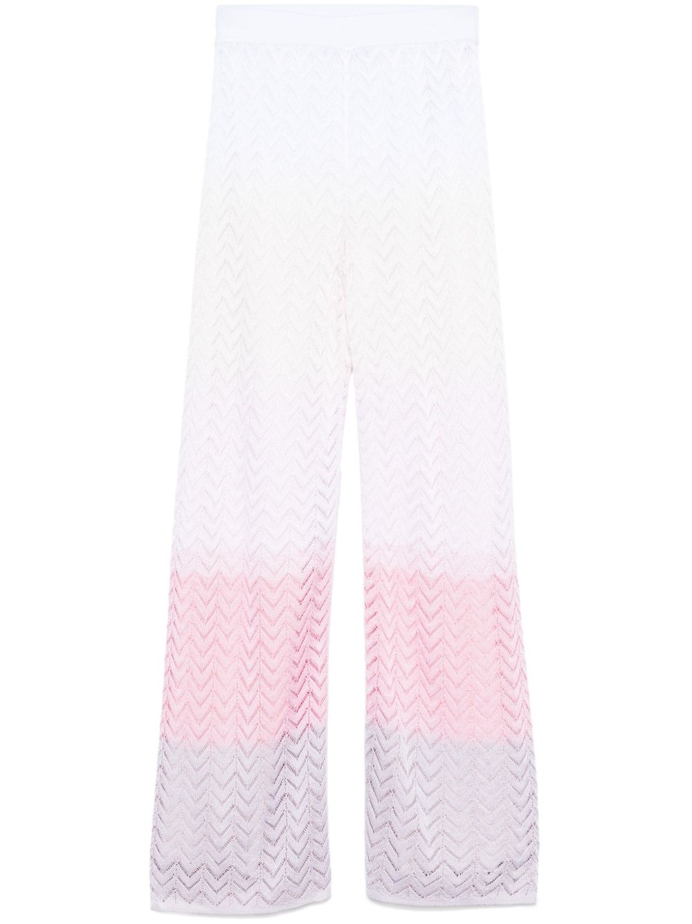 chevron-knit trousers Highlights - White - Elasticated waistband - Ombre effect - The item you receive may differ slightly from the item photographed. this is due to the artisanal nature with which all missoni products are constructed. Made in Italy Composition Outer: Viscose 100% Lining: Polyester 82%, Elastane 18% SIZE & FIT Model measurements Height 5 ft 10 in(1.78 m) Bust/Chest 33.85 in(86 cm) Hips 36.61 in(93 cm) Waist 26.77 in(68 cm) FittingInformation Designed for a straight-leg fit, these trousers allow for a close fit at the waist and an unrestricted, comfortable fit over the leg The elasticated waist allows for a comfortable fit Made with a fine knit, this piece offers some stretch
