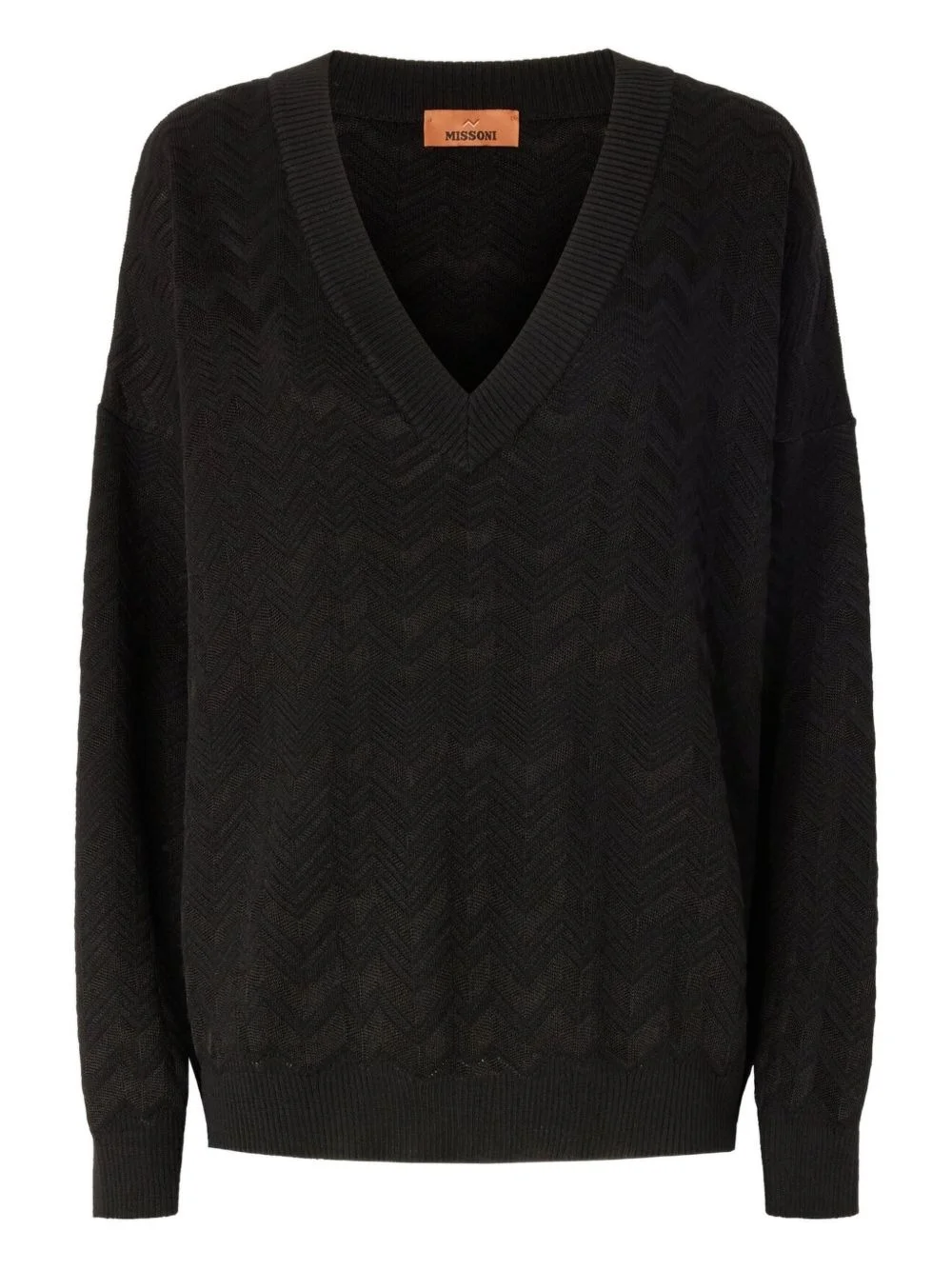chevron-pattern V-neck sweater Highlights - Black - Chevron pattern - V-neck - Long sleeves - Ribbed hem - The item you receive may differ slightly from the item photographed. this is due to the artisanal nature with which all missoni products are constructed. Made in Italy Composition Wool 49%, Rayon 44%, Polyester 5%, Elastane 1%, Polyamide 1% Washing instructions Read Manufacturer Guidelines