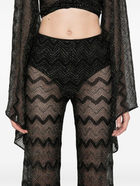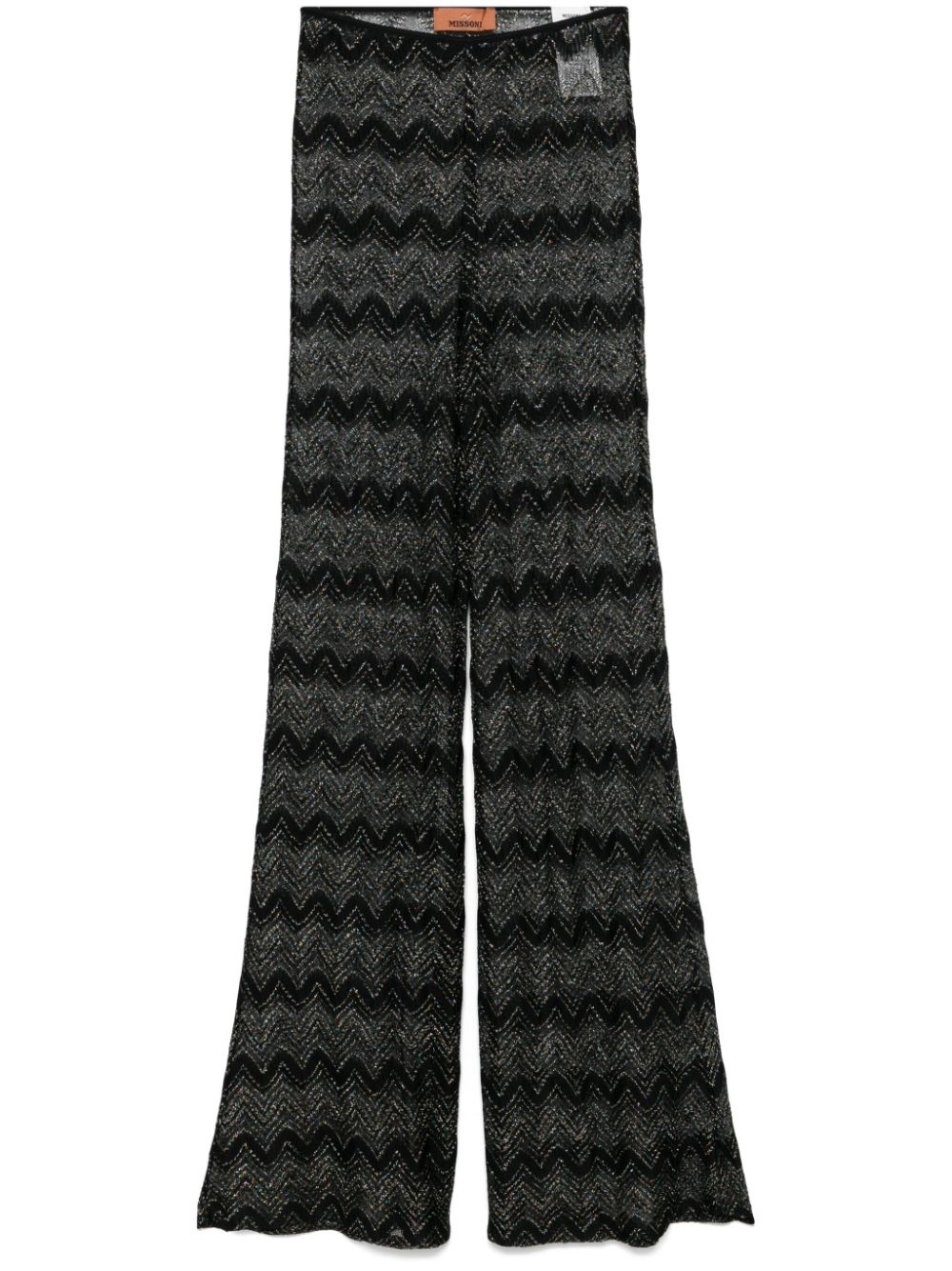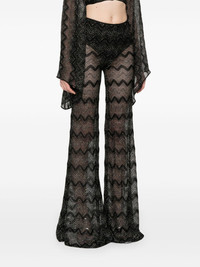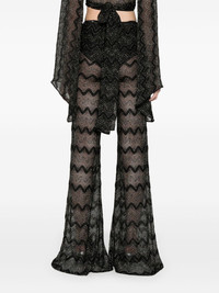 crochet-knit flared trousers Highlights - Black - Crochet knit - Signature zigzag woven design - Flared leg - Elasticated waistband - Metallic threading - High-waisted - The item you receive may differ slightly from the item photographed. this is due to the artisanal nature with which all missoni products are constructed. Made in Italy Composition Viscose 91%, Metallic Fibre 9% SIZE & FIT Model measurements Height 5 ft 9 in(1.75 m) Bust/Chest 31.88 in(81 cm) Hips 34.64 in(88 cm) Waist 24.01 in(61 cm) FittingInformation Designed with a flared hem, these trousers allow for a close fit at the waist with a slim fit over the leg and widening towards the hem The elasticated waist allows for a comfortable fit Made with a fine knit, this piece offers some stretch