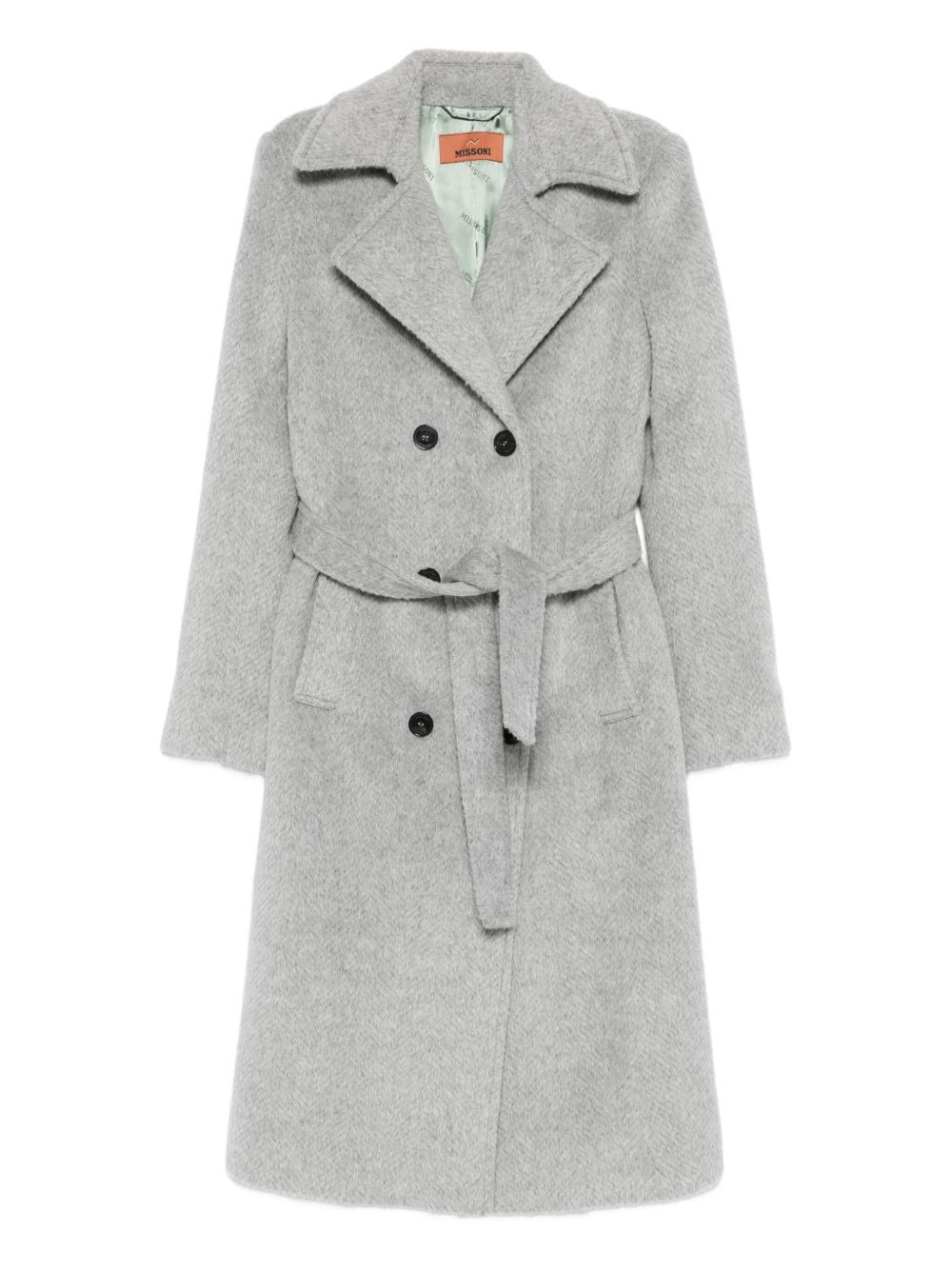 double-breasted belted coat Highlights - Grey - Double-breasted fastening - Belted waist - Notched lapel - Long sleeves - The item you receive may differ slightly from the item photographed. this is due to the artisanal nature with which all missoni products are constructed. Made in Italy Composition Outer: Alpaca 66%, Polyamide 20%, Wool 14% Lining: Viscose 100% SIZE & FIT Model measurements Height 5 ft 10 in(1.78 m) Bust/Chest 33.46 in(85 cm) Hips 36.22 in(92 cm) Waist 23.22 in(59 cm) Washing instructions Dry Clean Only