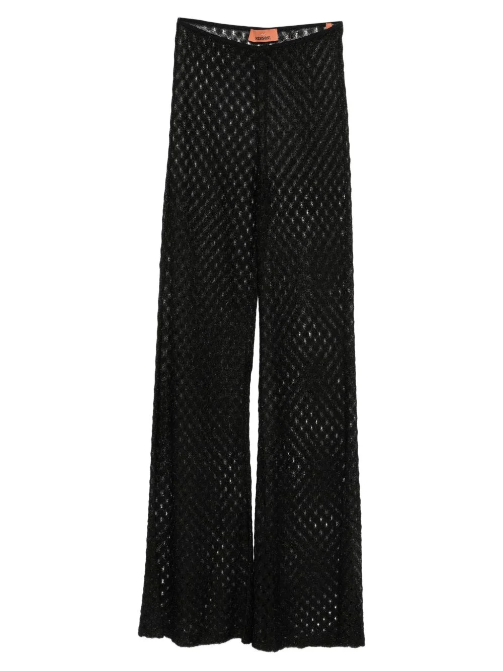 flared trousers Highlights - Black - Flared - Elasticated waistband - The item you receive may differ slightly from the item photographed. this is due to the artisanal nature with which all missoni products are constructed. Made in Italy Composition Outer: Viscose 83%, Metallised Fibres 17% Lining: Polyamide 80%, Elastane 20% SIZE & FIT Model measurements Height 5 ft 10 in(1.79 m) Bust/Chest 30.31 in(77 cm) Hips 34.64 in(88 cm) Waist 23.62 in(60 cm) Washing instructions Dry Clean Only