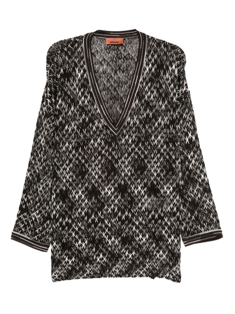 geometric-pattern V-neck sweater Highlights - Black - Geometric pattern - V-neck - Three-quarter sleeves - Ribbed trims - Open weave - The item you receive may differ slightly from the item photographed. this is due to the artisanal nature with which all missoni products are constructed. Made in Italy Composition Wool 54%, Viscose 46% SIZE & FIT Model measurements Height 5 ft 10 in(1.77 m) Bust/Chest 33.07 in(84 cm) Hips 37 in(94 cm) Waist 24.8 in(63 cm) Washing instructions Dry Clean Only