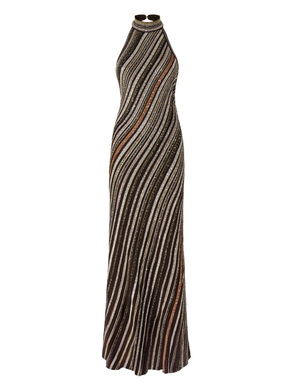 halterneck striped maxi dress Highlights - Dark brown - Halterneck - Open back - Striped pattern - Details embellishment - Maxi length - The item you receive may differ slightly from the item photographed. this is due to the artisanal nature with which all missoni products are constructed. Made in Italy Composition Outer: Rayon 68%, Polyamide 27%, Metallic Fibre 4%, Elastane 1% Lining: Polyester 88%, Elastane 12% Washing instructions Read Manufacturer Guidelines