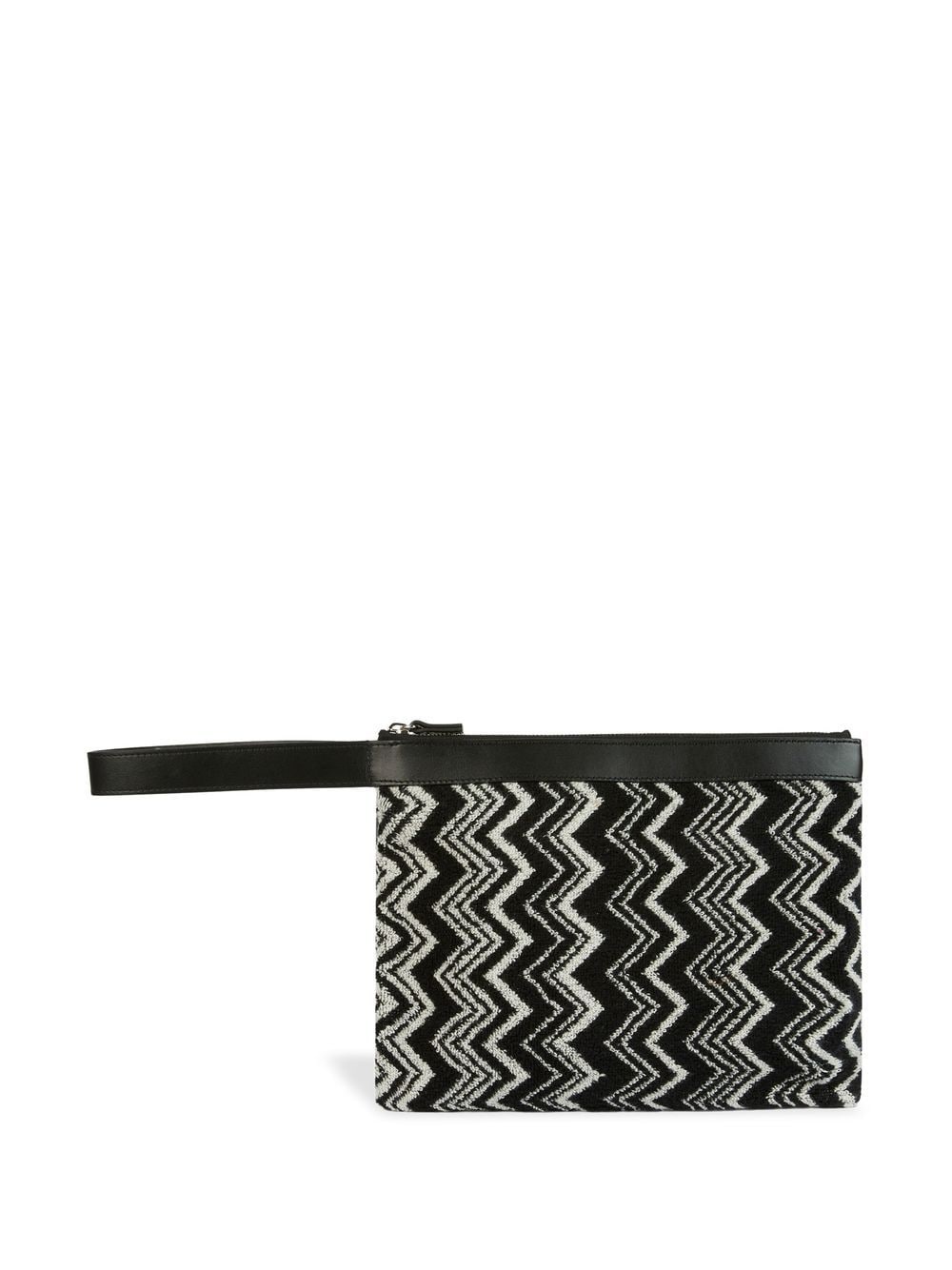 Keith zigzag-pattern pouch Highlights - Black/white - Cotton/leather - Leather trim - Signature zigzag woven design - Wrist strap - Top zip fastening - Main compartment - Internal zip-fastening pocket - The item you receive may differ slightly from the item photographed. this is due to the artisanal nature with which all missoni products are constructed. Made in Italy Composition Outer: Cotton 100%, Calf Leather 100% SIZE & FIT Measurement HEIGHT 9.84 in(25 cm) WIDTH 11.02 in(28 cm)