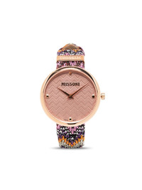 M1 34mm The Italian house of Missoni is most notably known for its signature chevron knit found throughout each collection. Stepping away from the clothing world and into accessories, this M1 34mm proudly displays the iconic zig-zag pattern across the dial for a stamp of approval. Highlights - Stainless steel case - Rose gold-tone hardware - Quartz movement - Rose pink dial - Zigzag-embossed dial - Raised logo detail - Round face - Index hands - Screw-down crown - Fabric strap - Pin-buckle fastening - This item comes with a standard two-year warranty from the brand. Imported SIZE & FIT Model measurements Height 5 ft 11 in(1.8 m) Bust/Chest 33.07 in(84 cm) Hips 37.4 in(95 cm) Waist 25.19 in(64 cm) Measurement DIAMETER 1.37 in(3.5 cm) Minimum Length 5.9 in(15 cm) Thickness 0.27 in(0.7 cm) TOTAL LENGTH 7.87 in(20 cm) WIDTH 0.59 in(1.5 cm)