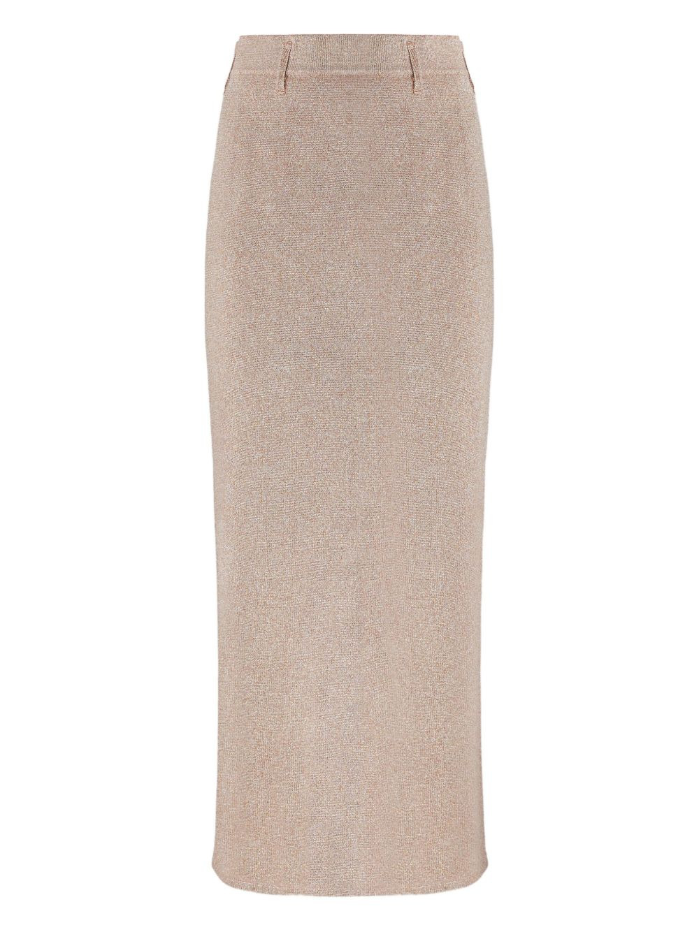 metallic knit skirt Highlights - Beige - Metallic knit - Fitted silhouette - High waist - Centre back vent - Straight hem - The item you receive may differ slightly from the item photographed. this is due to the artisanal nature with which all missoni products are constructed. Imported Composition Rayon 85%, Metallic Fibre 12%, Polyamide 2%, Elastane 1% Washing instructions Read Manufacturer Guidelines