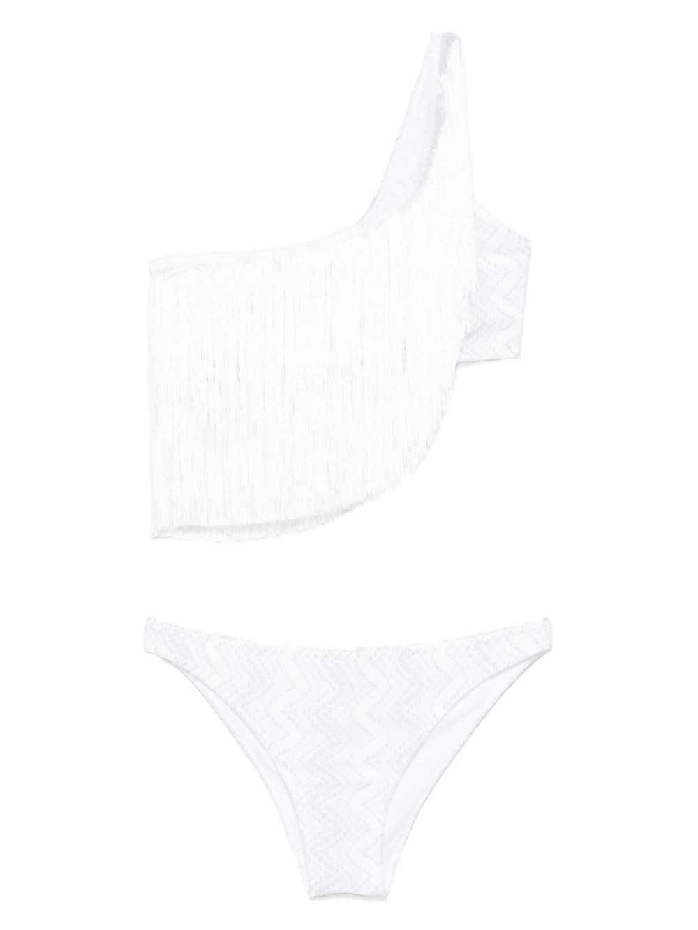 one-shoulder fringed bikini Highlights - White - Full lining - Signature zigzag woven design - Be mindful to try on swimwear over your own garments. - The item you receive may differ slightly from the item photographed. this is due to the artisanal nature with which all missoni products are constructed. Made in Italy Composition Outer: Viscose 91%, Metallised Fibres 9% Lining: Polyamide 80%, Elastane 20%