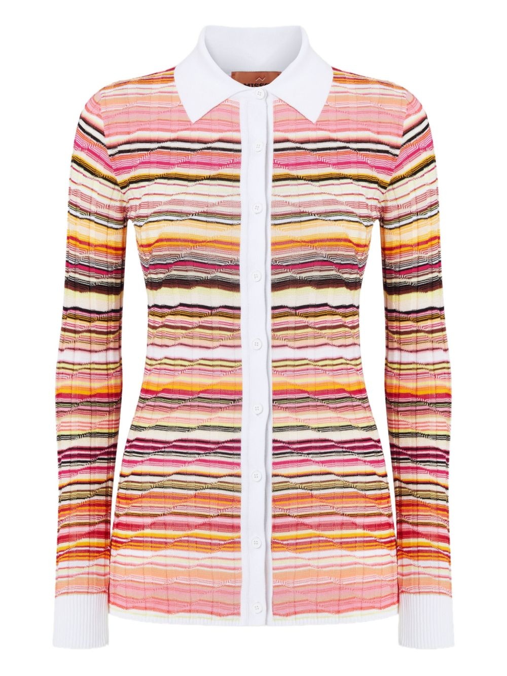 striped knitted shirt Highlights - Salmon pink - Front button fastening - Contrasting collar - Contrasting cuffs - Ribbed edge - The item you receive may differ slightly from the item photographed. this is due to the artisanal nature with which all missoni products are constructed. Imported Composition Cotton 75%, Rayon 23%, Spandex/Elastane 1%, Polyamide 1%