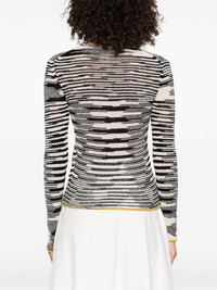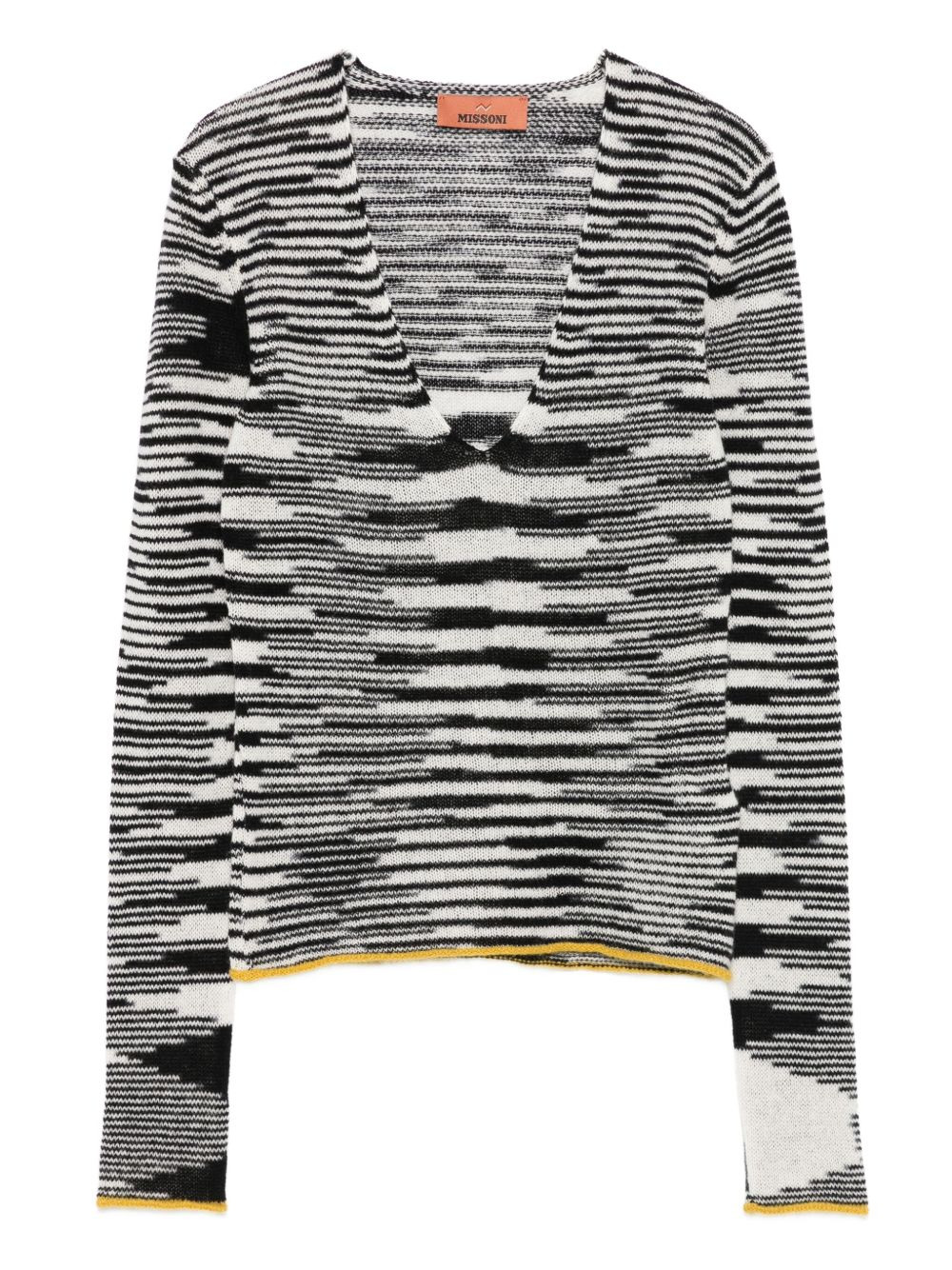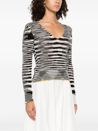 striped-pattern V-neck sweater Highlights - Black and white - Yellow trim - V-neck - Long sleeves - Horizontal stripe pattern - The item you receive may differ slightly from the item photographed. this is due to the artisanal nature with which all missoni products are constructed. Made in Italy Composition Cashmere 89%, Wool 11% SIZE & FIT Model measurements Height 5 ft 10 in(1.79 m) Bust/Chest 31.88 in(81 cm) Hips 35.43 in(90 cm) Waist 23.62 in(60 cm) Washing instructions Hand Wash