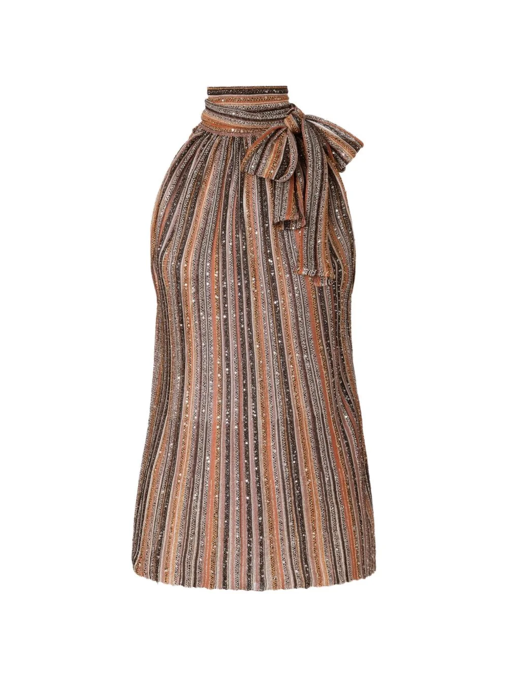 striped tie neck top Highlights - Brown - Striped - Tie detail - High neck - Sleeveless - Gathered detail - The item you receive may differ slightly from the item photographed. this is due to the artisanal nature with which all missoni products are constructed. Made in Italy Composition Rayon 67%, Polyamide 20%, Metallic Fibre 13% Washing instructions Read Manufacturer Guidelines