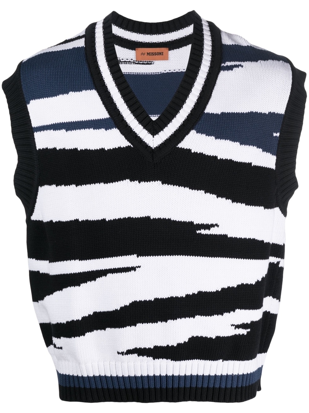 V-neck knitted vest top Highlights - Black/white/blue - Cotton blend - Ribbed detailing - Patterned intarsia knit - V-neck - Sleeveless - Straight hem - The item you receive may differ slightly from the item photographed. this is due to the artisanal nature with which all missoni products are constructed. Made in Italy Composition Cotton 68%, Polyamide 32% SIZE & FIT Model measurements Height 6 ft 2 in(1.88 m) Bust/Chest 36.61 in(93 cm) Hips 35.82 in(91 cm) Waist 27.95 in(71 cm) FittingInformation Designed for a relaxed fit, this piece allows for comfort and movement when worn Made with a midweight knit, this piece offers some stretch This piece fits true to size – take your usual size Washing instructions Dry Clean Only