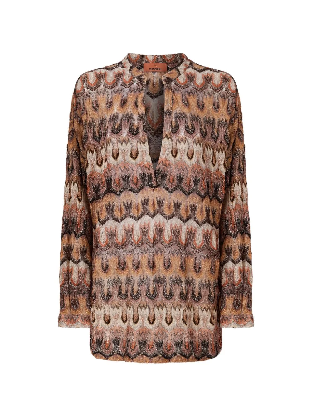 v-neck patterned top Highlights - Brown - Patterned - V-neck - Long sleeves - Sheer finish - Straight hem - The item you receive may differ slightly from the item photographed. this is due to the artisanal nature with which all missoni products are constructed. Made in Italy Composition Rayon 90%, Metallised Fibres 10% Washing instructions Read Manufacturer Guidelines