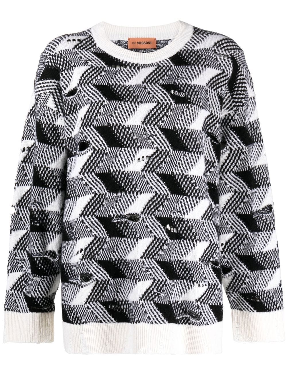 woven-knit jumper Highlights - Black/white - Wool blend - All-over graphic print - Crew neck - Long sleeves - The item you receive may differ slightly from the item photographed. this is due to the artisanal nature in which all missoni products are constructed. Made in Italy Composition Wool 98%, Polyester 2% SIZE & FIT Model measurements Height 5 ft 11 in(1.8 m) Bust/Chest 31.49 in(80 cm) Hips 35.43 in(90 cm) Waist 25.19 in(64 cm) FittingInformation This piece fits true to size. We recommend you get your regular size Cut for a loose fit Made with a mid-weight fabric Washing instructions Dry Clean Only