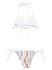 zigzag bikini Highlights - White - Halterneck tie fastening - Rear tie fastening - Side-tie bottoms - Be mindful to try on swimwear over your own garments. - The item you receive may differ slightly from the item photographed. this is due to the artisanal nature with which all missoni products are constructed. Made in Italy Composition Outer: Viscose 95%, Metallised Fibres 5% Lining: Polyamide 80%, Elastane 20% Washing instructions Hand Wash