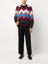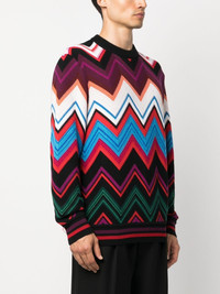 zigzag crew-neck jumper Highlights - Black/multicolour - Wool-cotton blend - Knitted construction - Full jacquard - Zigzag print - Striped edge - Crew neck - Long sleeves - Ribbed cuffs and hem - Straight hem - The item you receive may differ slightly from the item photographed. this is due to the artisanal nature with which all missoni products are constructed. Made in Italy Composition Wool 70%, Cotton 30% SIZE & FIT Model measurements Height 6 ft 1 in(1.86 m) Bust/Chest 37.4 in(95 cm) Hips 36.22 in(92 cm) Waist 29.52 in(75 cm) Measurement CHEST 44.88 in(114 cm) SLEEVE LENGTH 34.64 in(88 cm) Shoulder Width 18.11 in(46 cm) FittingInformation Designed to be unstructured, offering a loose fit throughout The ribbed hem offers a close, comfortable fit Made with a midweight knit, this piece offers some stretch This piece fits true to size – take your usual size Washing instructions Dry Clean Only