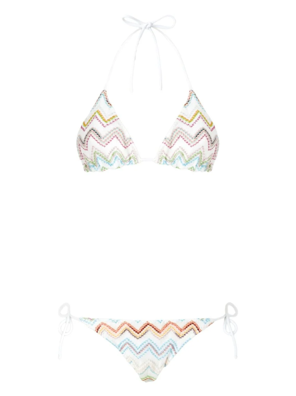 zigzag-knit bikini set Highlights - White - Rear lace-up fastening - Side lace-up fastening - Be mindful to try on swimwear over your own garments. - The item you receive may differ slightly from the item photographed. this is due to the artisanal nature with which all missoni products are constructed. Made in Italy Composition Viscose 61%, Polyester 30%, Metallic Fibre 9%